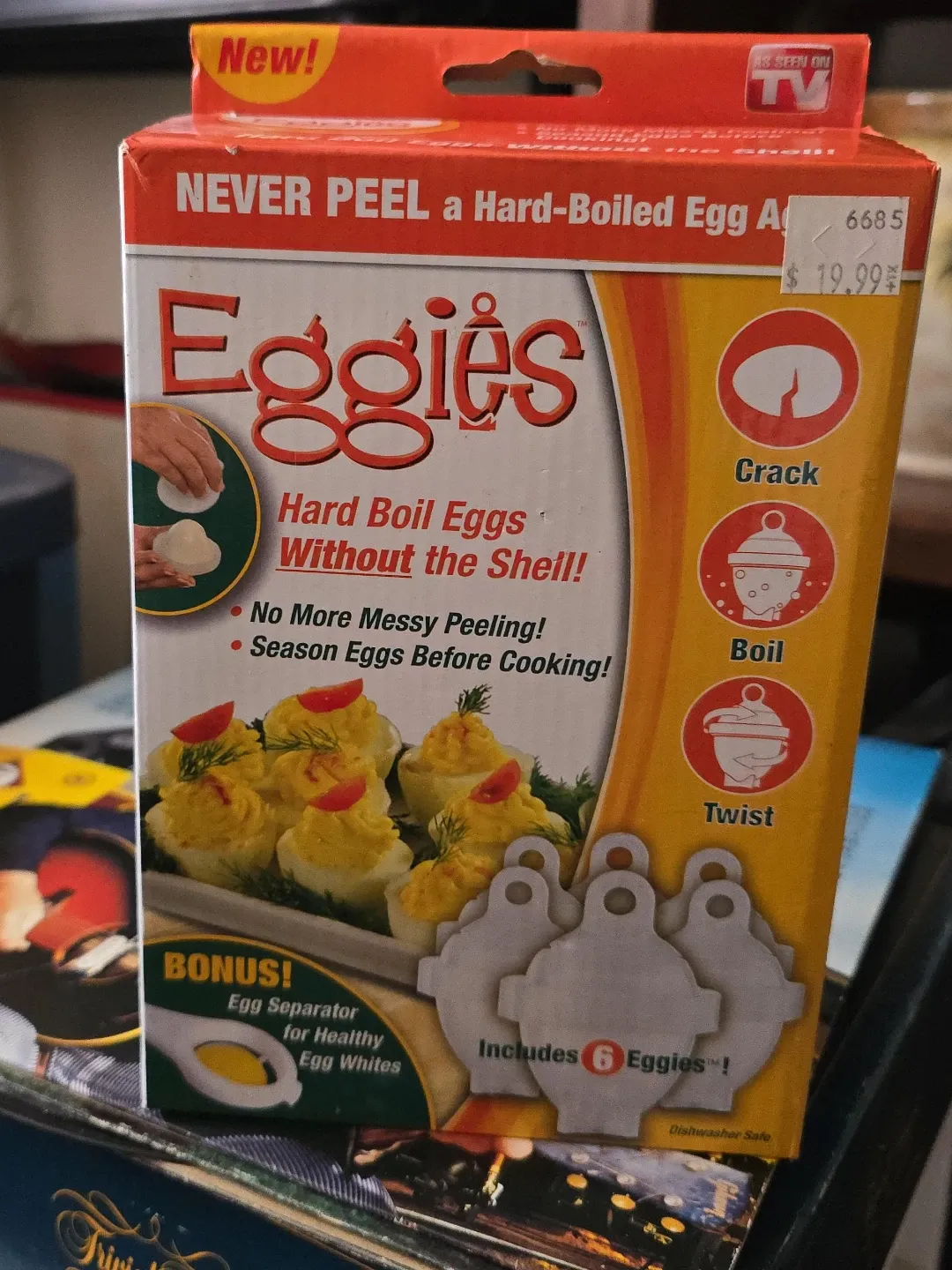 This set includes 6 Eggies for hard boiling eggs without the shell. It also comes with a BONUS egg separator for healthy egg whites. These are dishwasher safe!