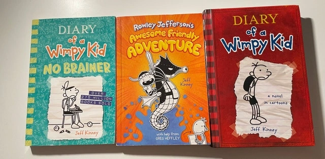 Selling a bundle of Diary of a Wimpy Kid books by Jeff Kinney, perfect for younger readers, siblings, or for a bit of nostalgia. Includes: Diary of a Wimpy Kid (original red hardcover book 1), Diary of a Wimpy Kid: No Brainer (book 18), and Rowley Jefferson’s Awesome Friendly Adventure. All books are in good overall condition with no missing pages.