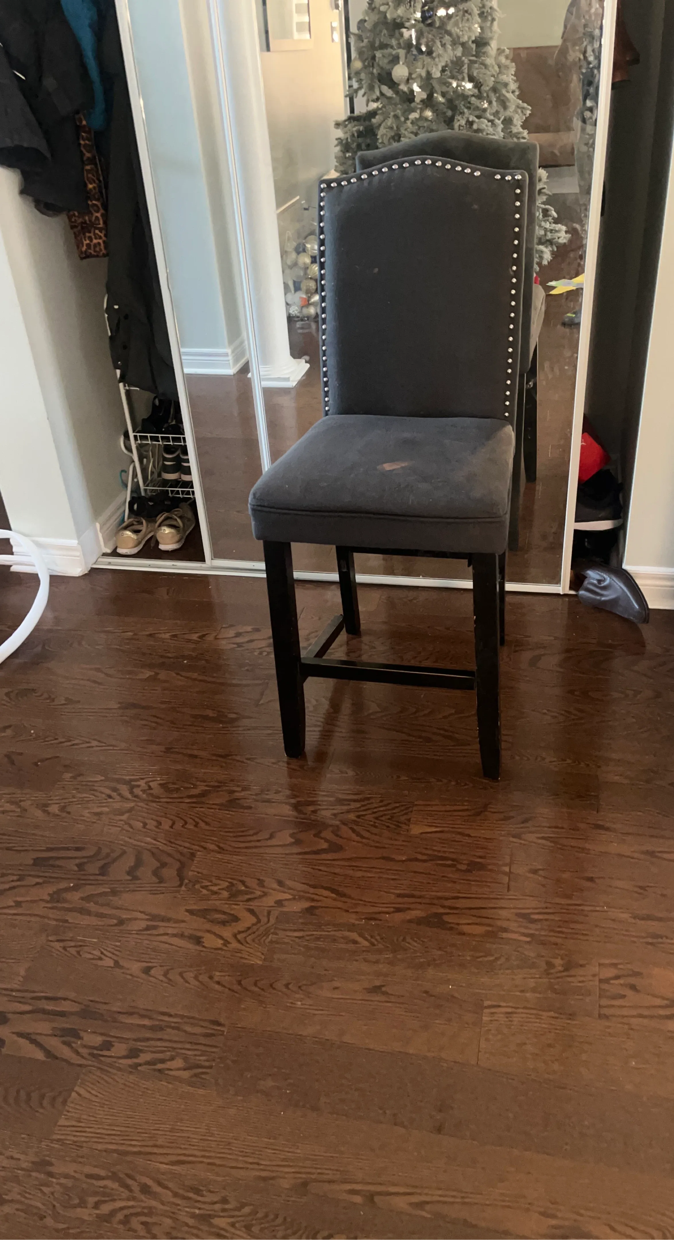 This dark grey upholstered bar stool has silver nailhead trim. It's a counter height stool with wooden legs. Some minor stains on the seat.