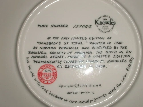 Selling a Norman Rockwell collector plate from 1979, titled "Somebody's Up There." It's fine china, about 8.2" in diameter, featuring original artwork. Plate # 15702C, Bradex # 84-(R)70-1.6. No damage to mention. Feel free to message if you have any questions!