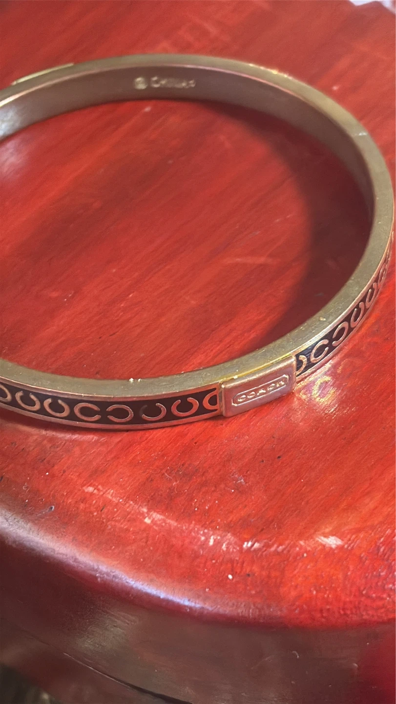 Coach bangle bracelet with signature 'C' pattern. Gold-tone metal with black enamel details. This classic accessory adds a touch of elegance. Was well loved and shows its wear. But this is free