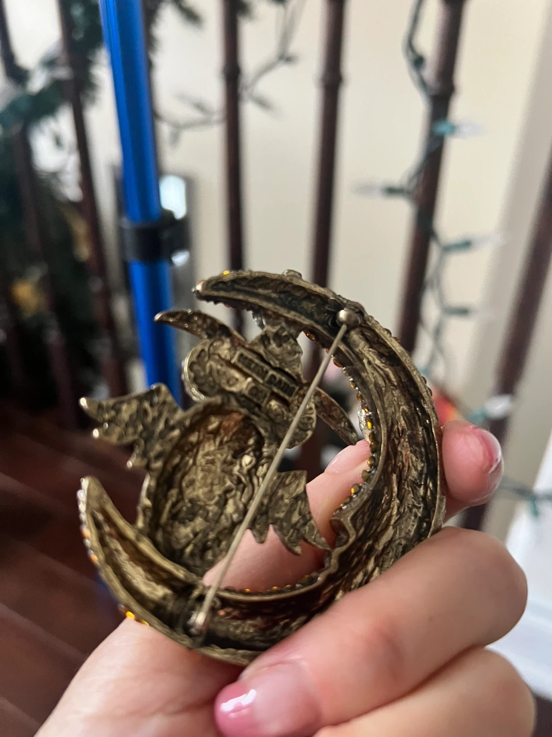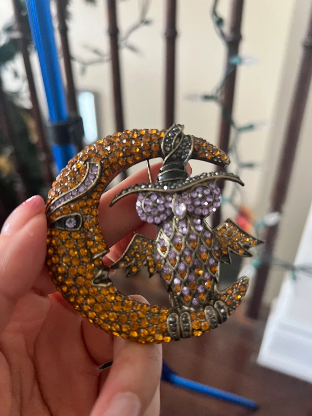 This sparkling brooch features an owl perched on a crescent moon, all adorned with colourful crystals. It's a fun accessory perfect for adding a touch of whimsy to your outfit. The pin backing is secure and easy to use.