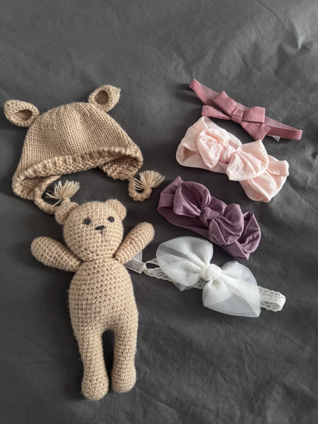 Includes a knit bear hat with ear details and ties. Also comes with four soft baby headbands in various colors and bow styles. Perfect for dressing up your little one!