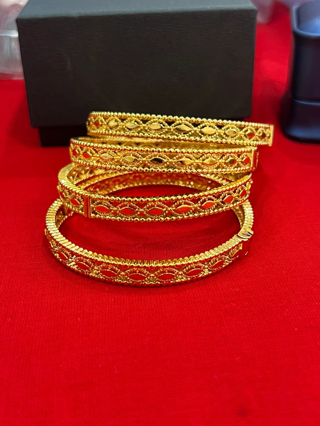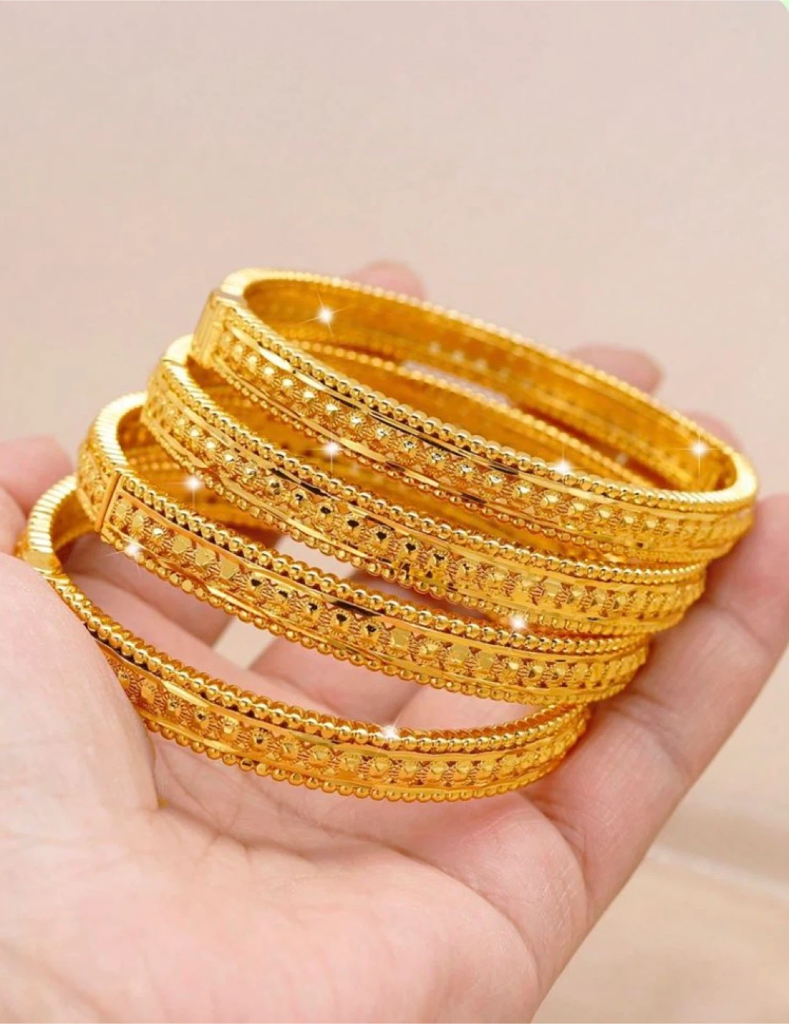 These four plated bangle bracelets feature intricate patterned detailing. They're a lovely addition to any jewelry collection. These bangles are perfect for stacking or wearing individually. Add a touch of elegance to your look!