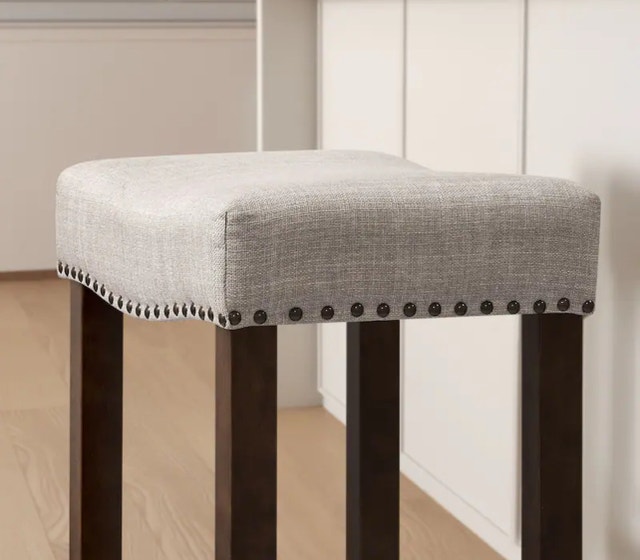 These brand-new Subrtex bar stools feature a stylish saddle design with linen upholstery and sturdy solid wood legs, perfect for adding a touch of elegance to your kitchen or bar area. These stools come in versatile colors that complement any decor. Features include: Saddle seat design for added comfort, solid wood frame for stability and durability, neutral linen upholstery, nailhead trim, and a footrest for comfort. If the ad's up, the stools are available.