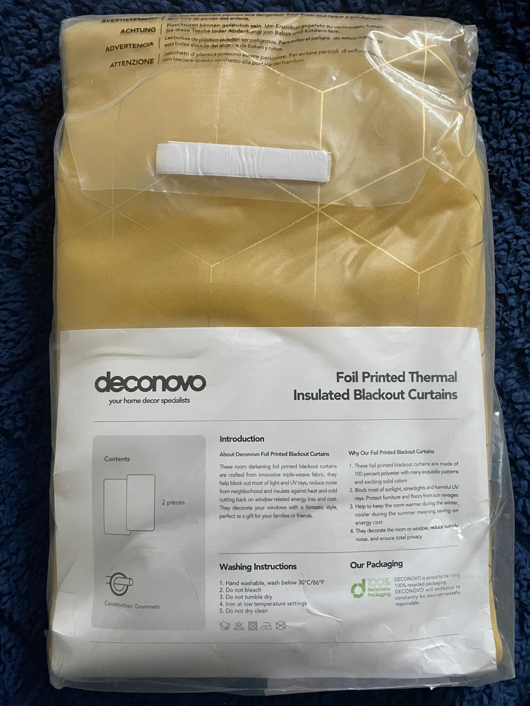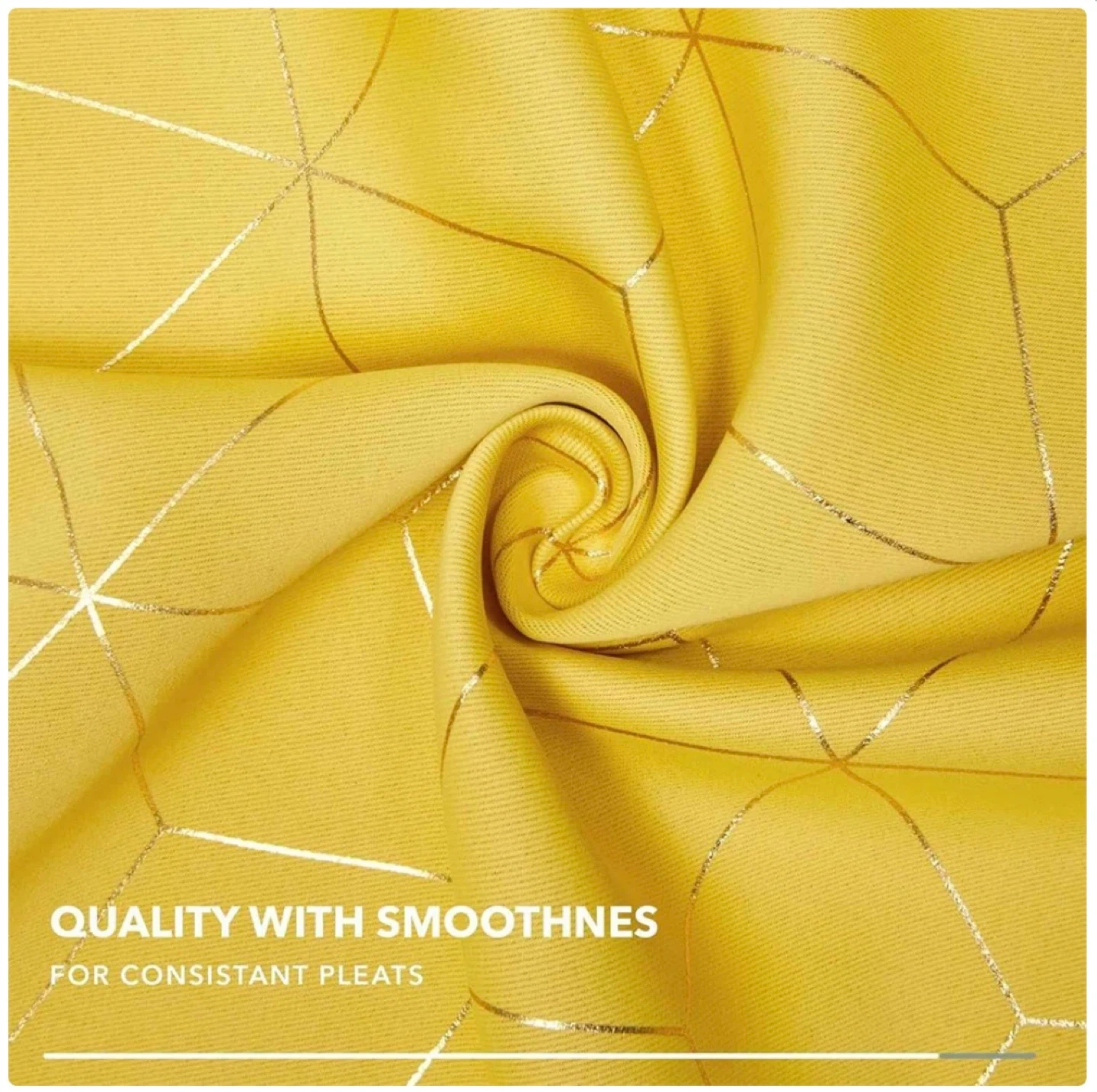 These yellow, gold foil printed blackout curtains are crafted from innovative triple-weave fabric. They help blockout light, thermal, and noise reducing energy saving. Their construction features grommets.