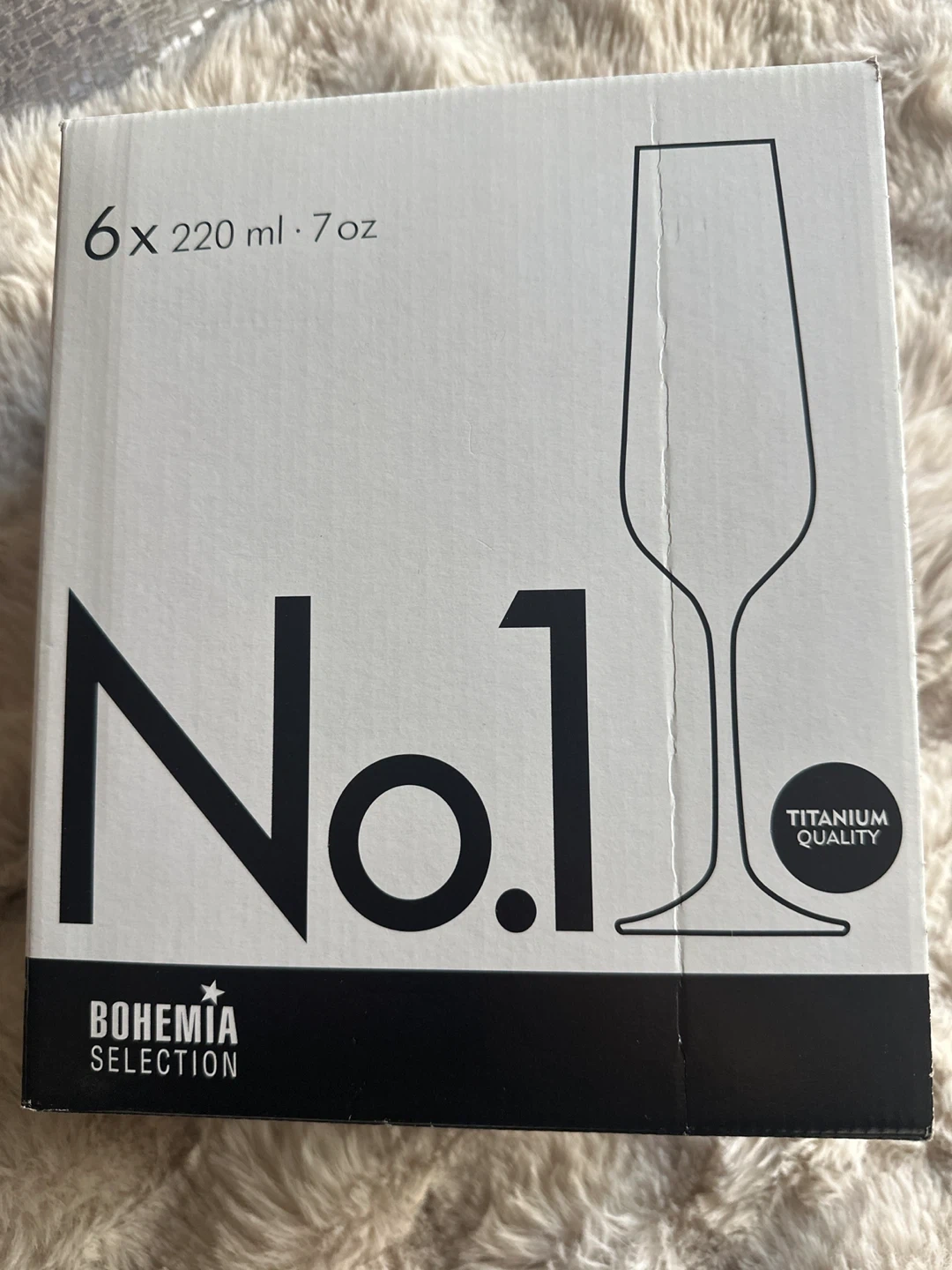 Selling a set of Bohemia Selection No.1 Titanium Quality glasses. The set includes 5 glasses, each with a 220 ml / 7 oz capacity. The box indicates "Titanium Quality," suggesting enhanced durability and clarity. Perfect for adding a touch of elegance to your table setting