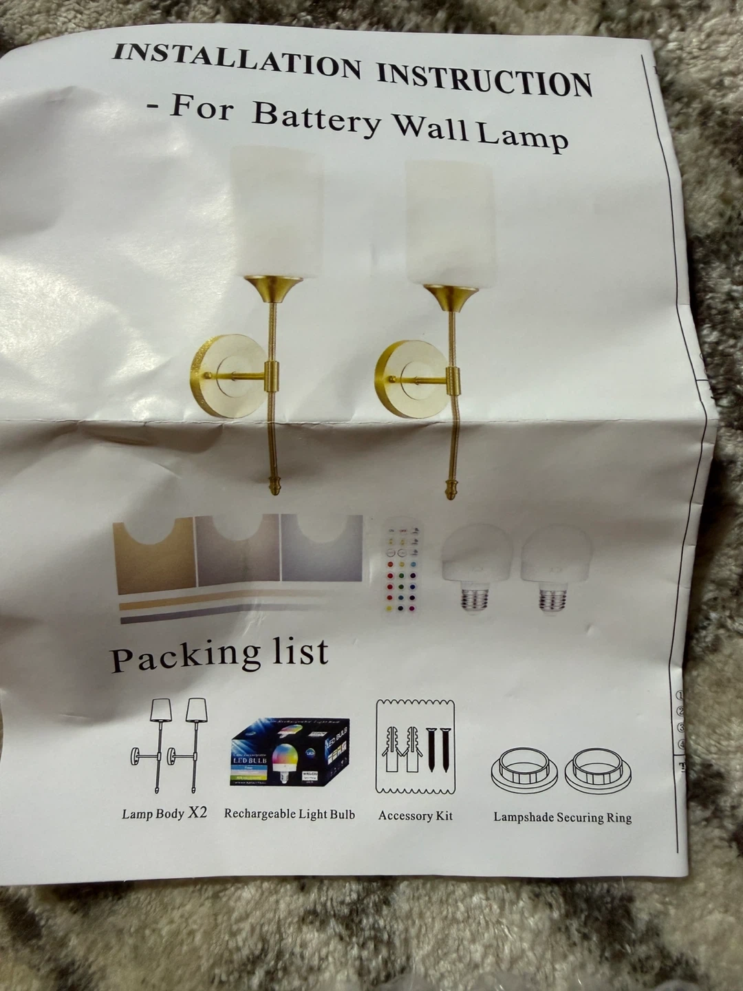 A remote control is included for colour and brightness adjustments. The installation manual and accessory kit are also present. These lamps are battery-operated, making them easy to install anywhere.