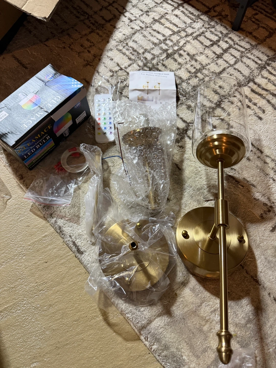 Includes two brass-toned wall lamps with glass shades and rechargeable LED bulbs.