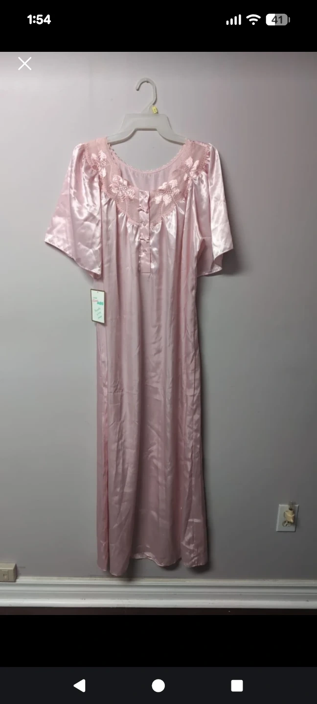 A lovely pink satin nightgown featuring delicate lace detailing around the neckline. It has short flutter sleeves and a button-up front. The material feels smooth and light.