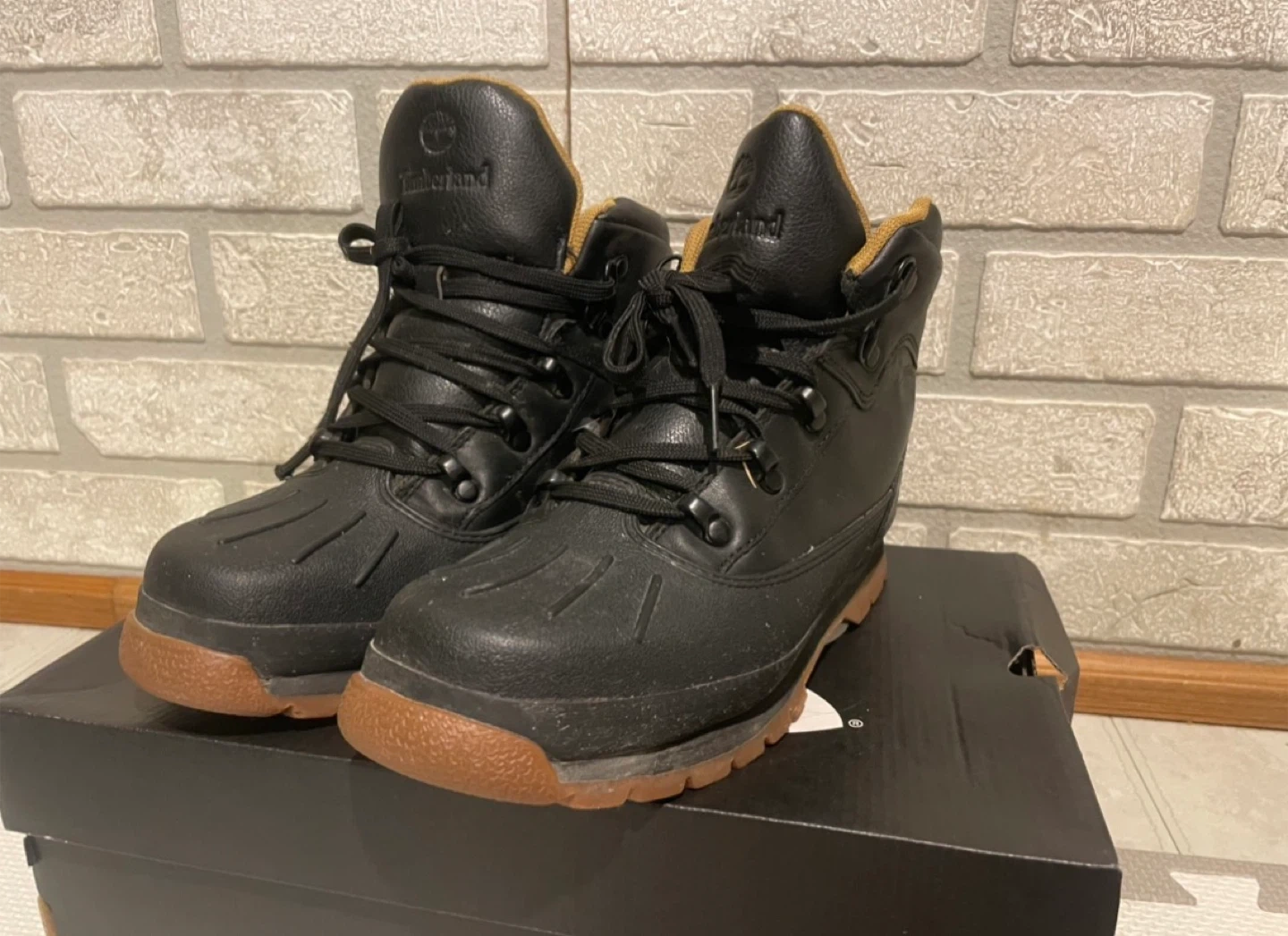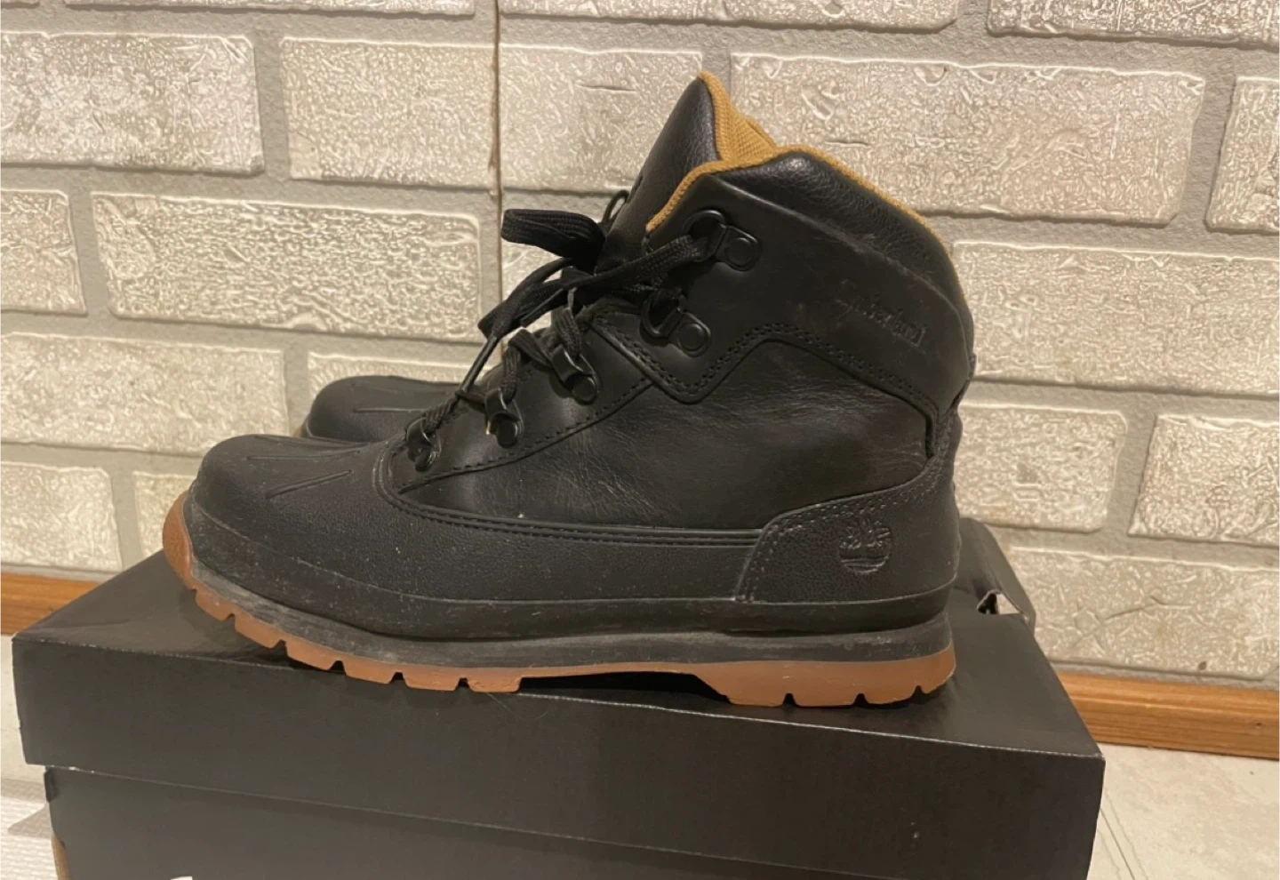 Timberland black leather boots with a waterproof design. Features a durable rubber sole and lace-up closure. Perfect for keeping your feet dry and warm.