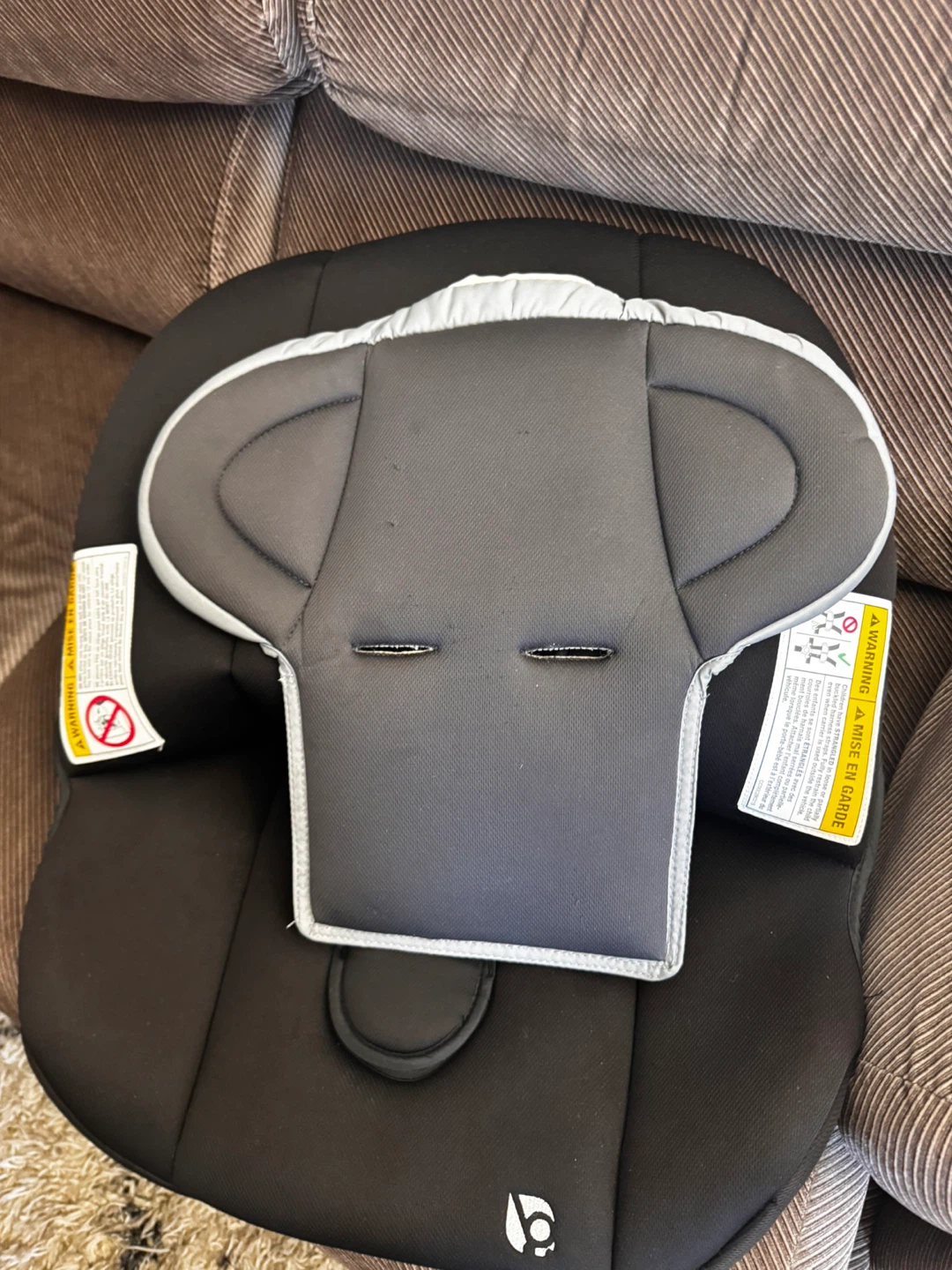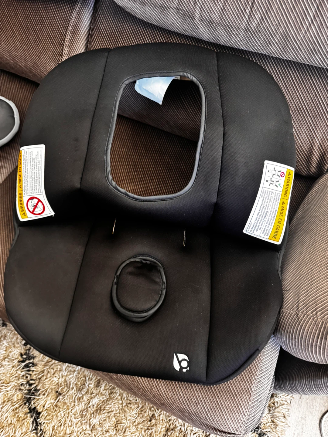 This is a black padded insert for a baby car seat. It's designed to provide extra comfort and support for infants. The insert is made of soft fabric and features a contoured shape. It's suitable for newborns and small babies needing additional cushioning in their car seat.