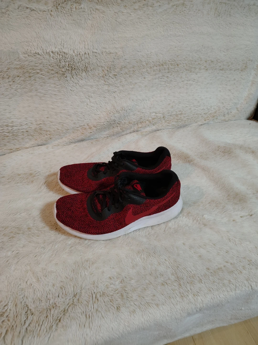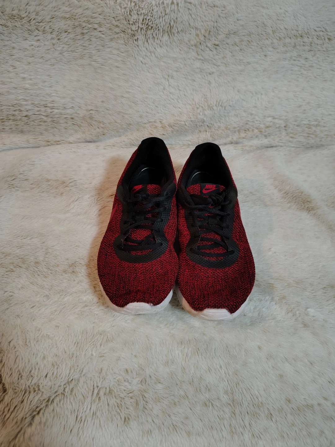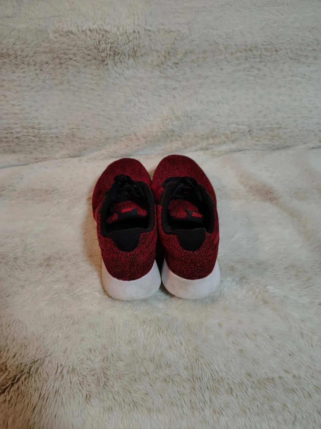 These Nike running shoes are a vibrant red with black accents and a clean white sole. They're lightweight and designed for comfort. They'd be great for casual wear or light jogs.