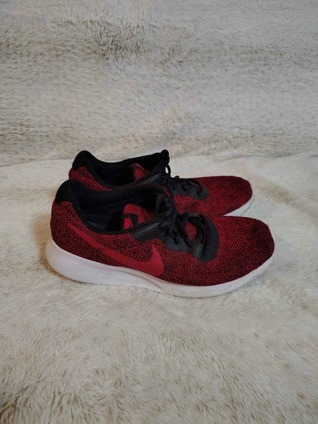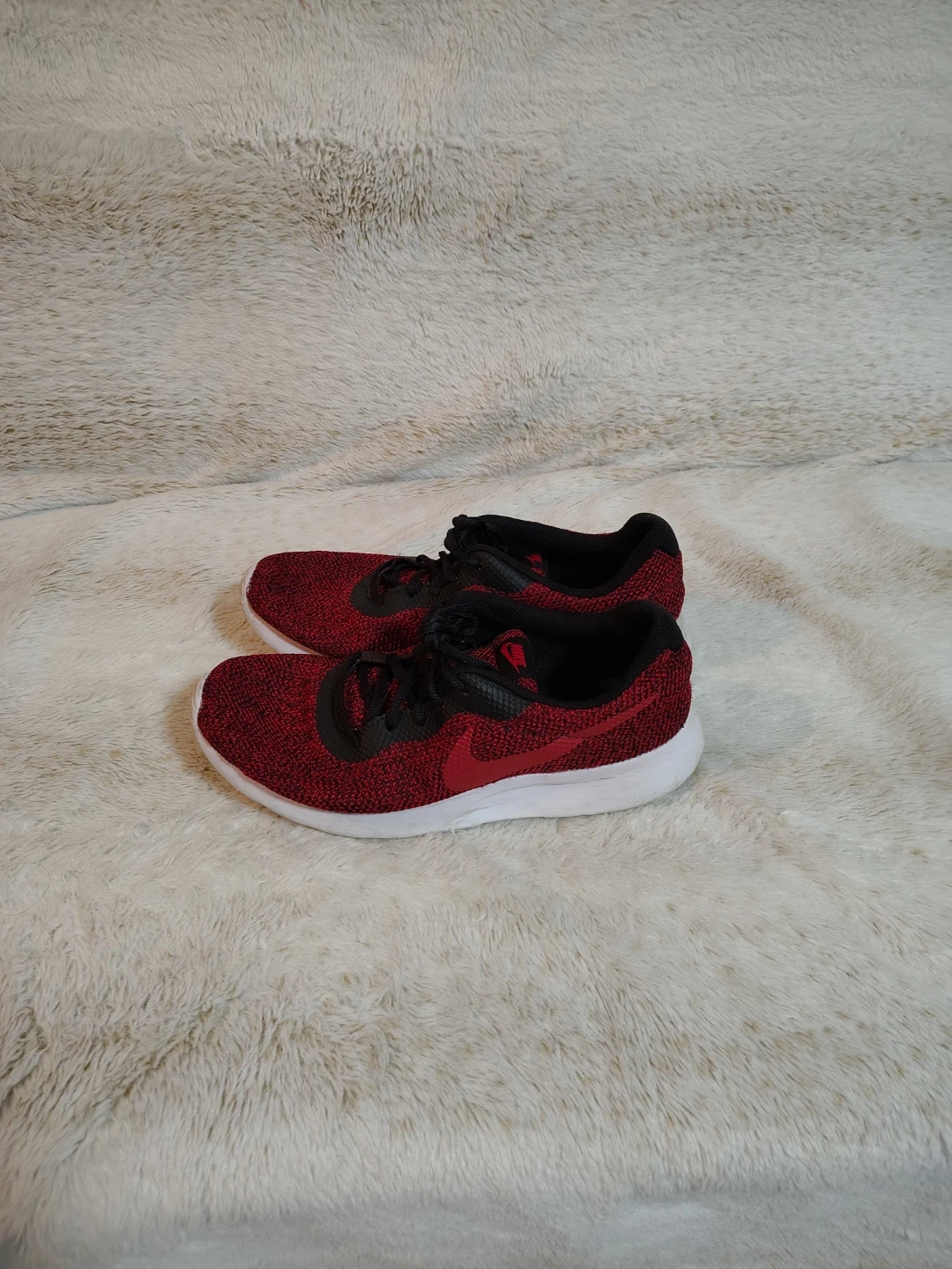 These Nike running shoes are a vibrant red with black accents and a clean white sole. They're lightweight and designed for comfort. They'd be great for casual wear or light jogs.