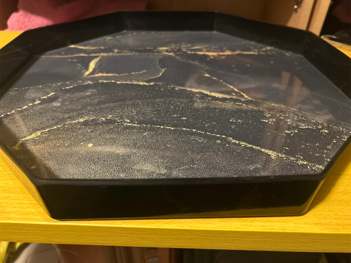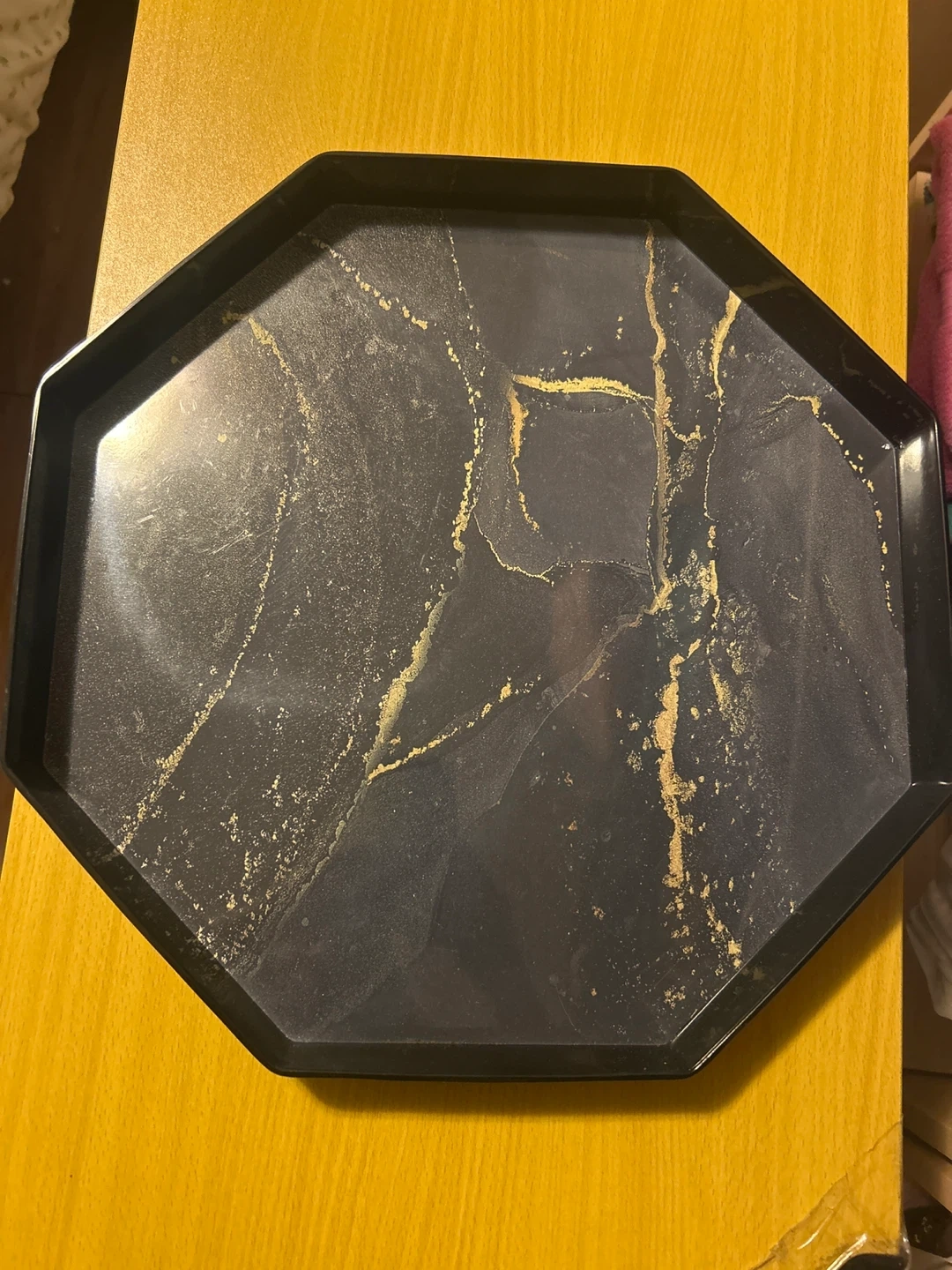 Octagonal serving tray with a black base and gold marbling pattern. It's made of a durable plastic material. This tray is great for serving drinks or appetizers at parties!
