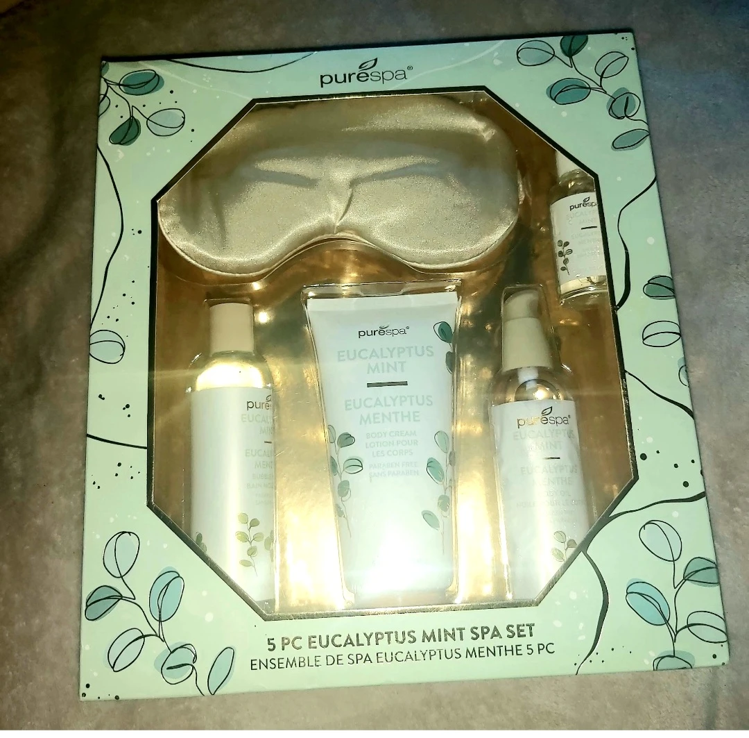 Treat yourself to a spa day at home with this PureSpa Eucalyptus Mint 5 piece set! It includes everything you need to relax and rejuvenate, featuring a soothing eucalyptus and mint scent