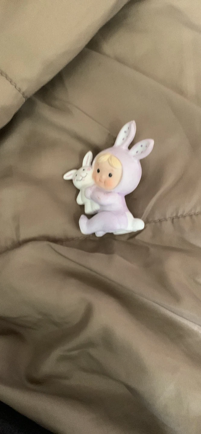 Cute figurine of a child dressed in a lavender bunny costume. It's holding a small white bunny. Perfect for Easter decor! Vintage hallmark