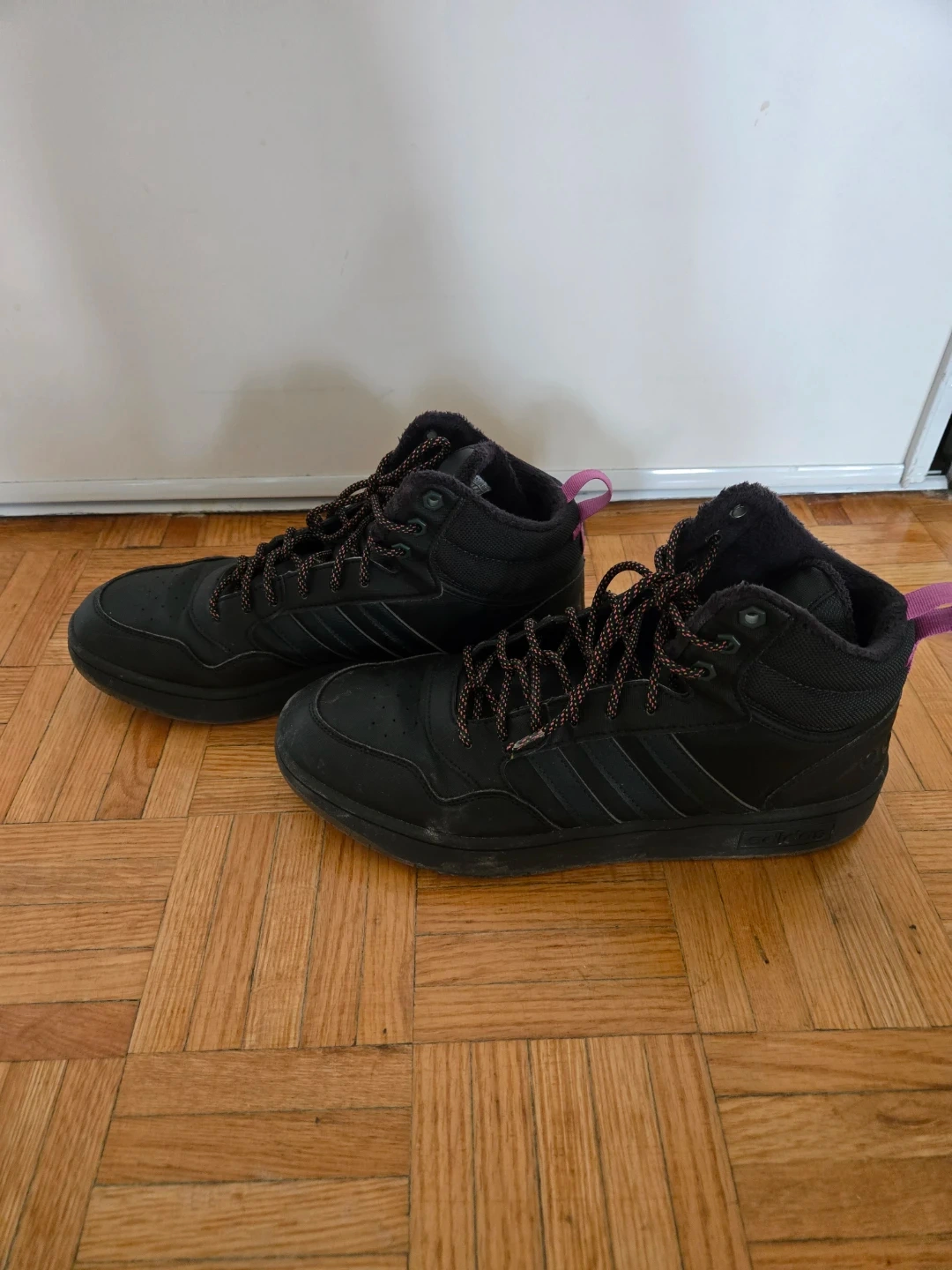 Black Adidas high top sneakers with patterned laces and fuzzy lining. These shoes offer a secure fit for everyday wear. Ideal for casual outings or cooler weather!