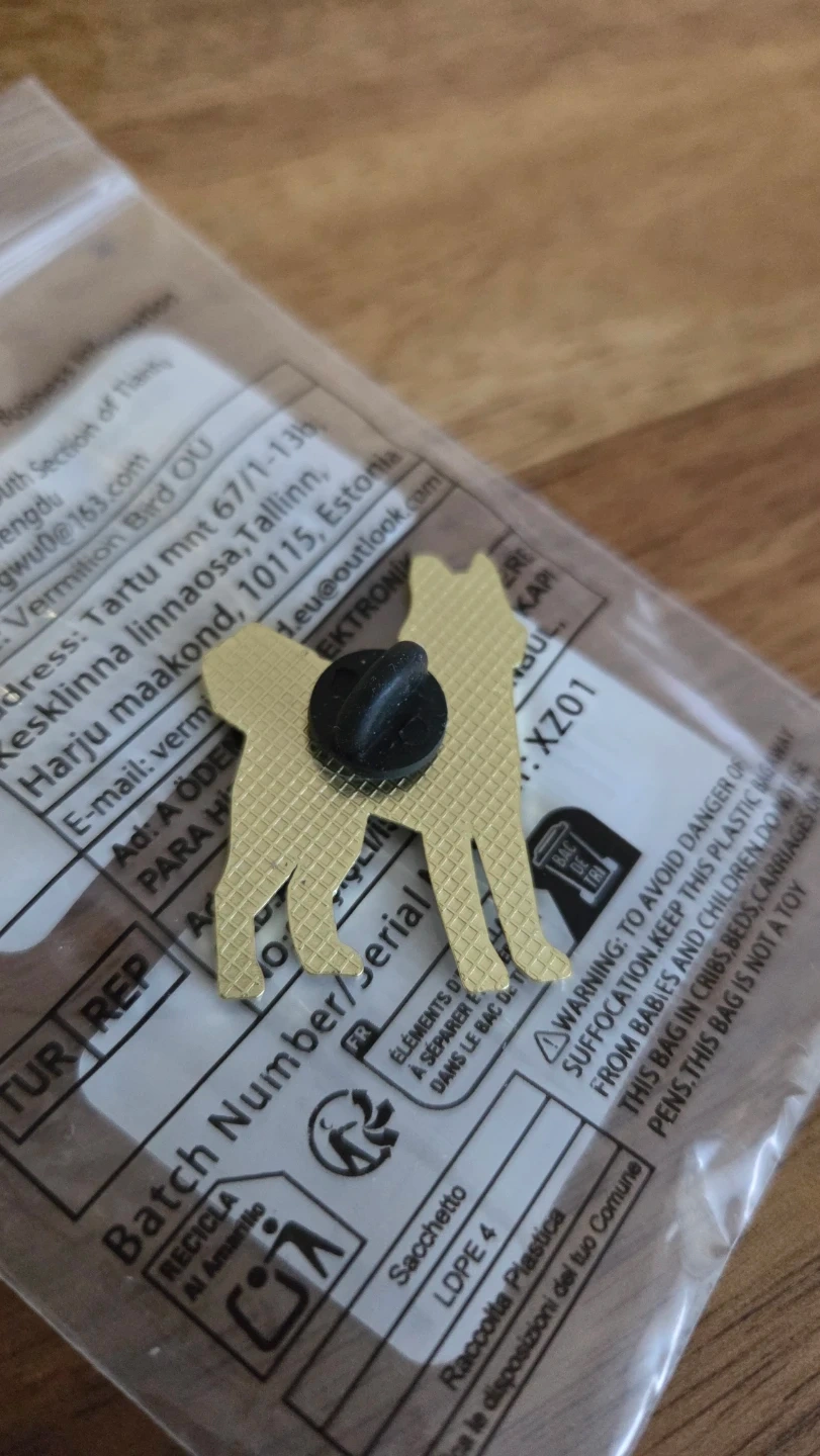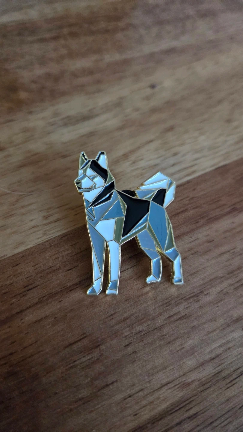 This is a brand new geometric origami-style enamel pin featuring a Siberian Husky. The pin has a gold-toned metal base with enamel detailing in black, white, and grey. It's perfect for adding a touch of personality to jackets, bags, or hats!