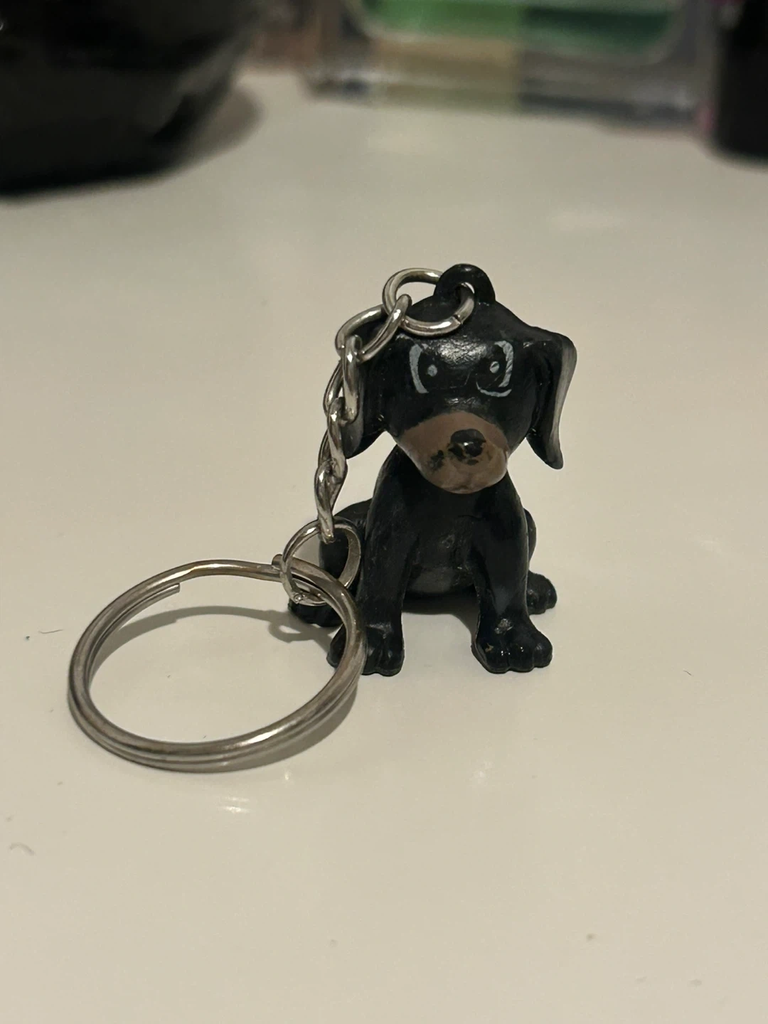 Cute black dog keychain. It's attached to a silver-tone keyring and chain.
