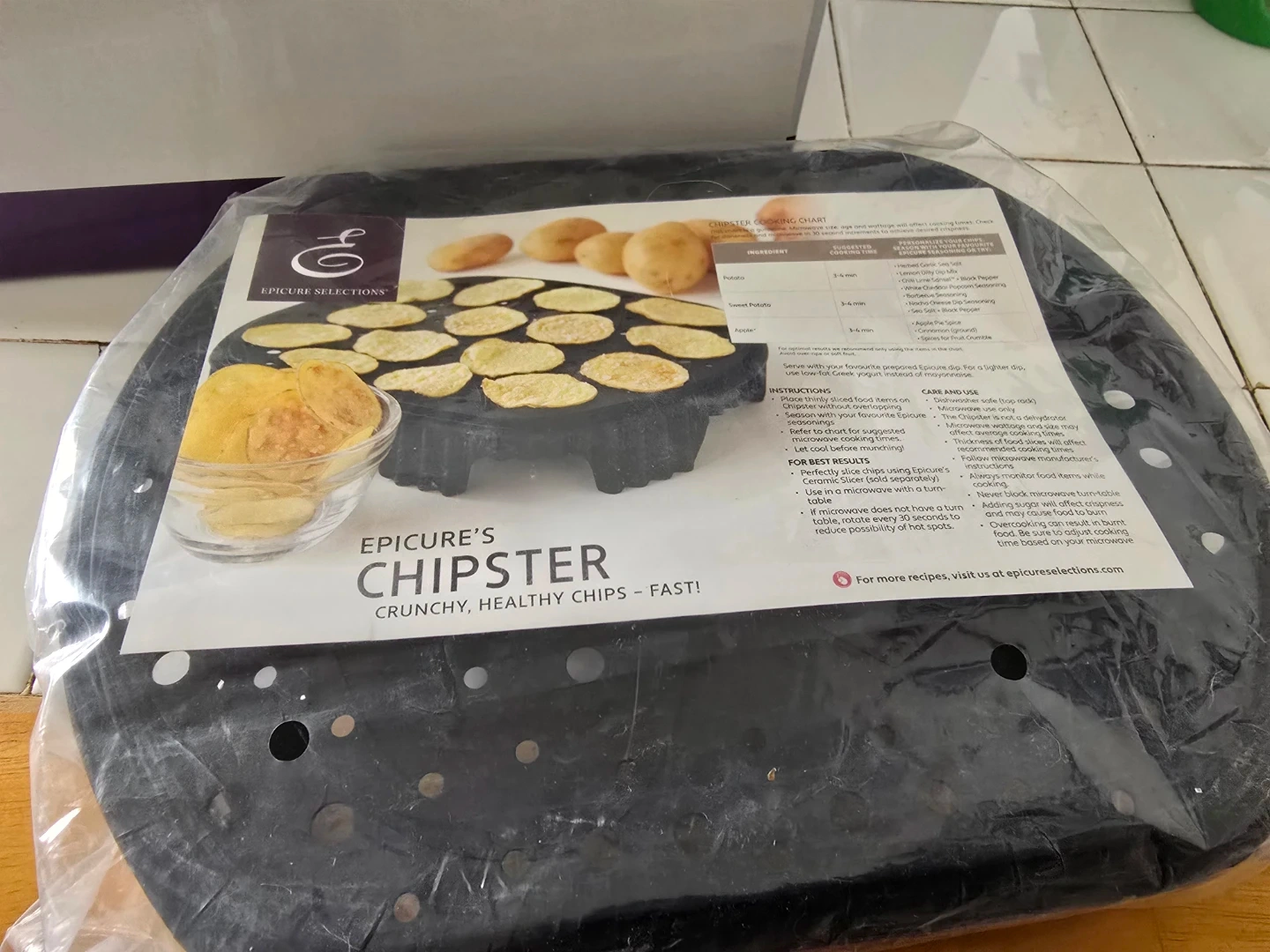 Make crunchy, healthy chips right in your microwave! This Epicure Selections Chipster is designed for making thinly sliced food items into chips. Follow the included chart for suggested cooking times based on your microwave's wattage.