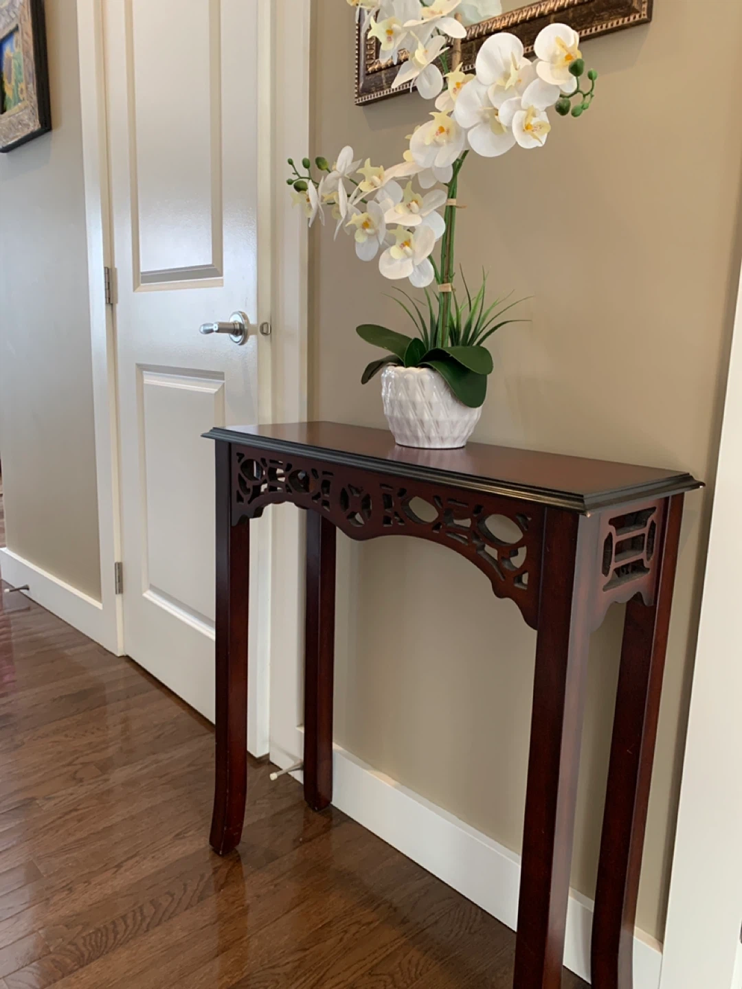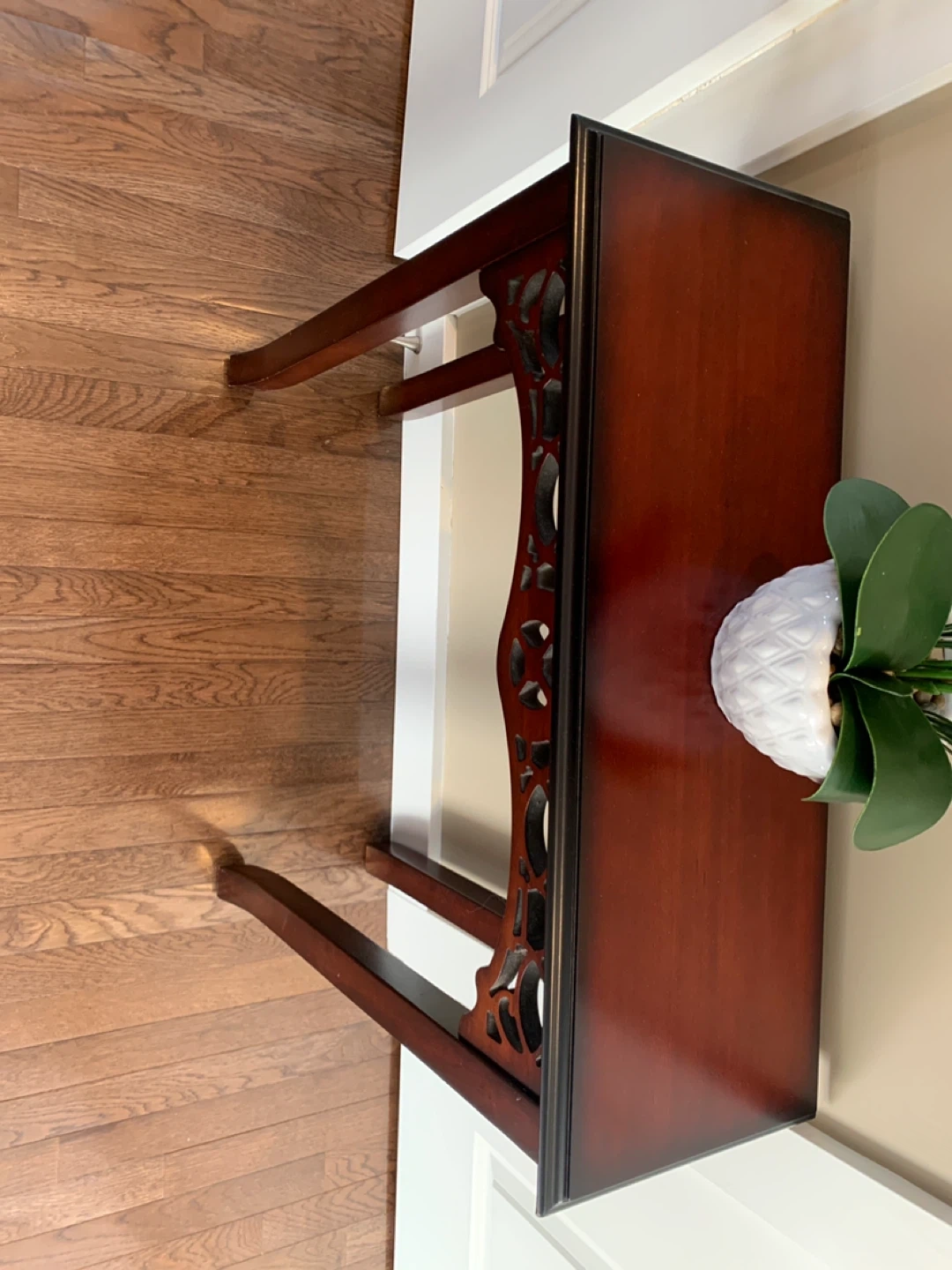 A dark wood console table with decorative carvings. It's a narrow table perfect for an entryway or hallway.