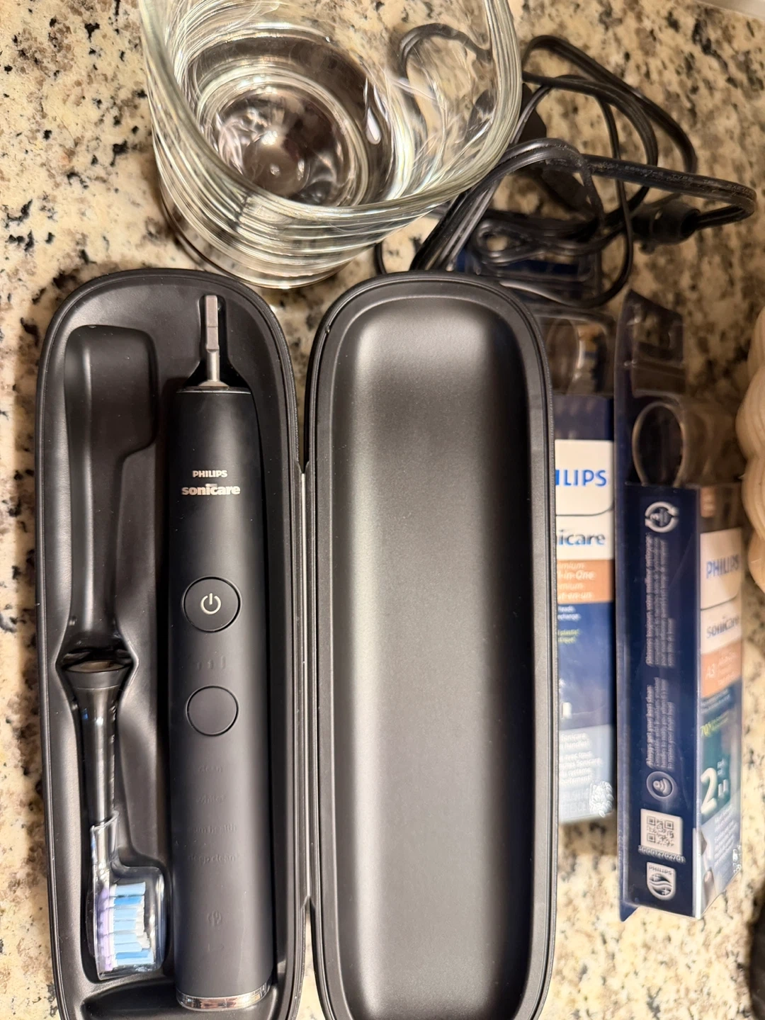 Like-new Philips DiamondClean Smart 9350, includes wireless charging cup, charging case, as well as 2 packs of A3 brush heads ($44.99ea) so added $90 value.