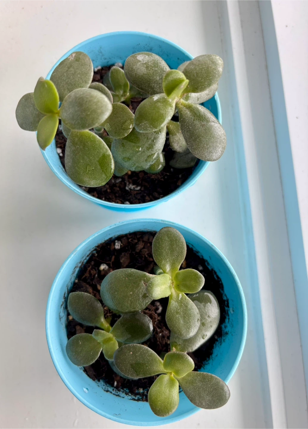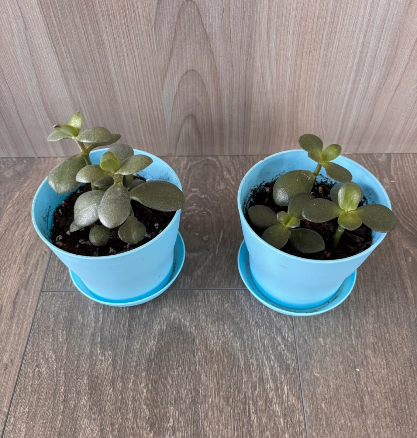 Six little healthy jade plants are ready to go to a new home! They're potted in two light blue plastic containers with matching saucers. Perfect for adding a bit of green to your space!