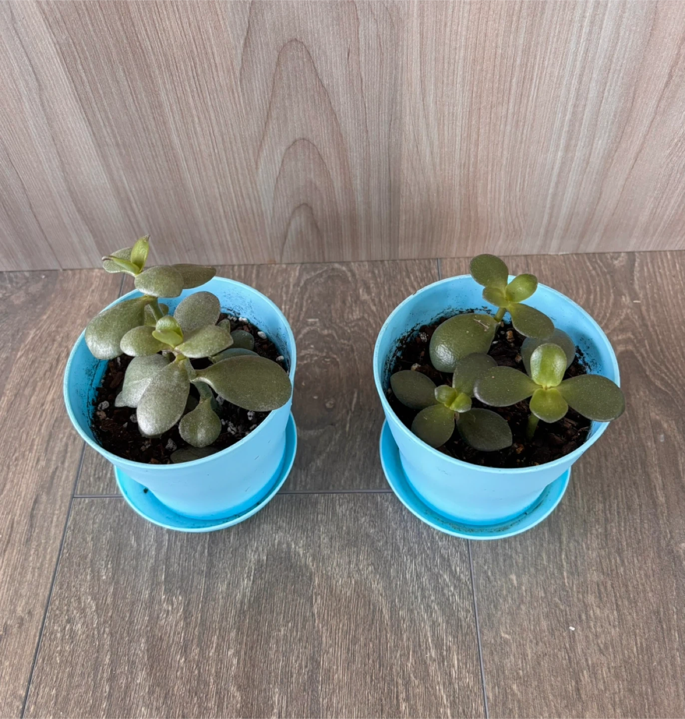 Six little healthy jade plants are ready to go to a new home! They're potted in two light blue plastic containers with matching saucers. Perfect for adding a bit of green to your space!