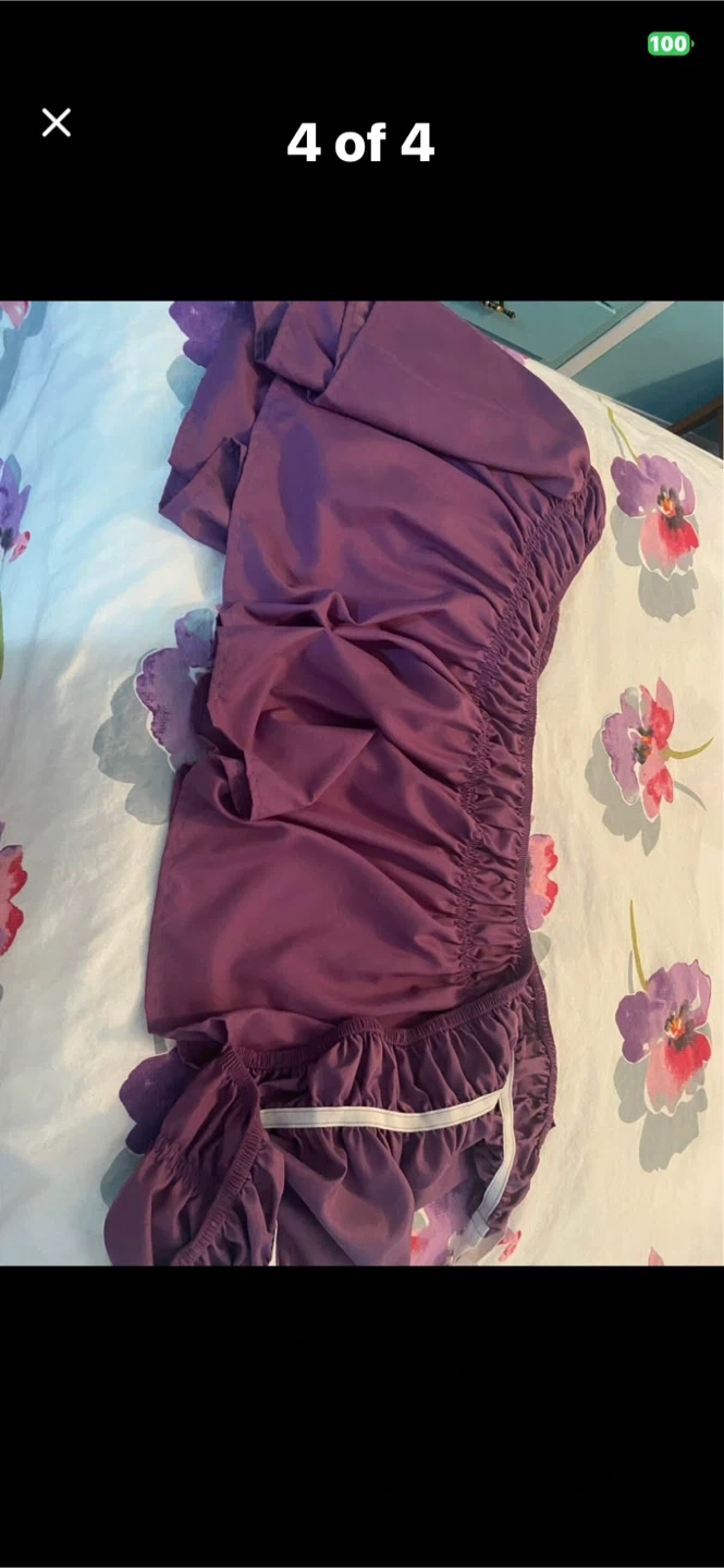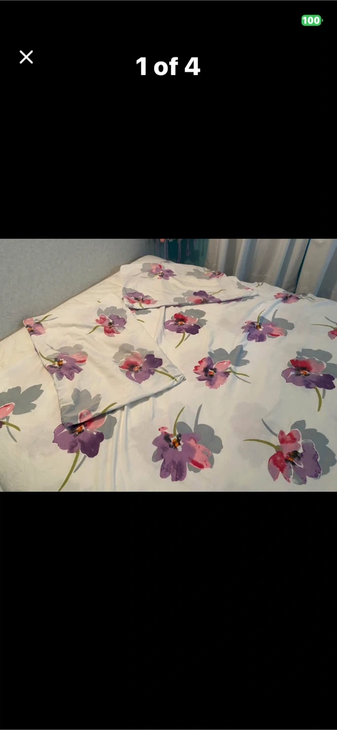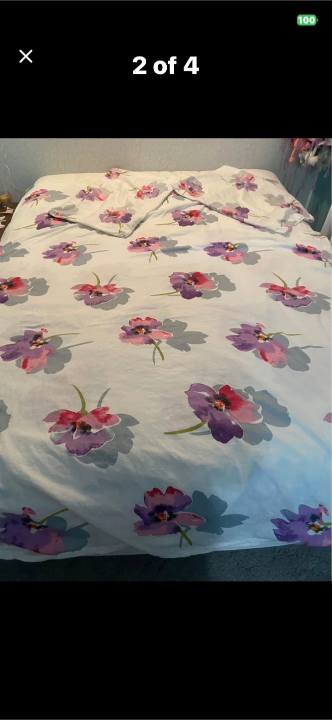 Floral print duvet cover and pillowcase set. Features a vibrant floral design with purple and pink flowers on a white background. Includes one duvet cover and one pillowcase with purple bed skirt. Cotton blend material.
