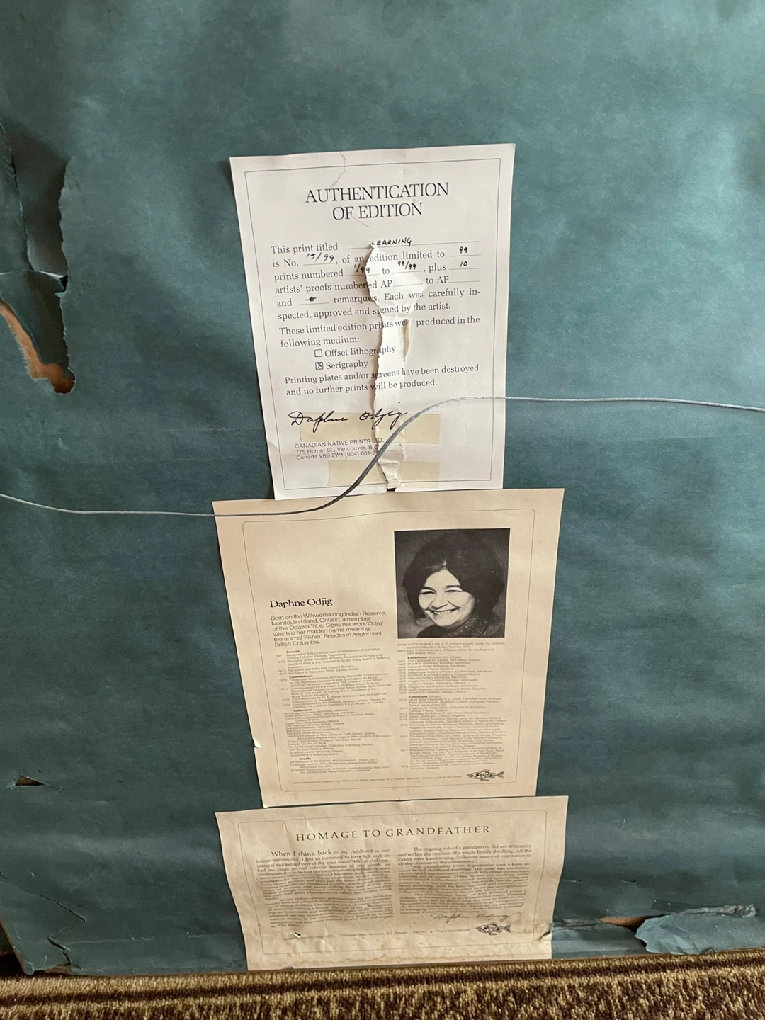 This is a framed offset lithograph print by Daphne Odjig, titled "Homage to Grandfather". It's part of an edition limited to 99 prints plus 10 artist's proofs. The print is signed by the artist.