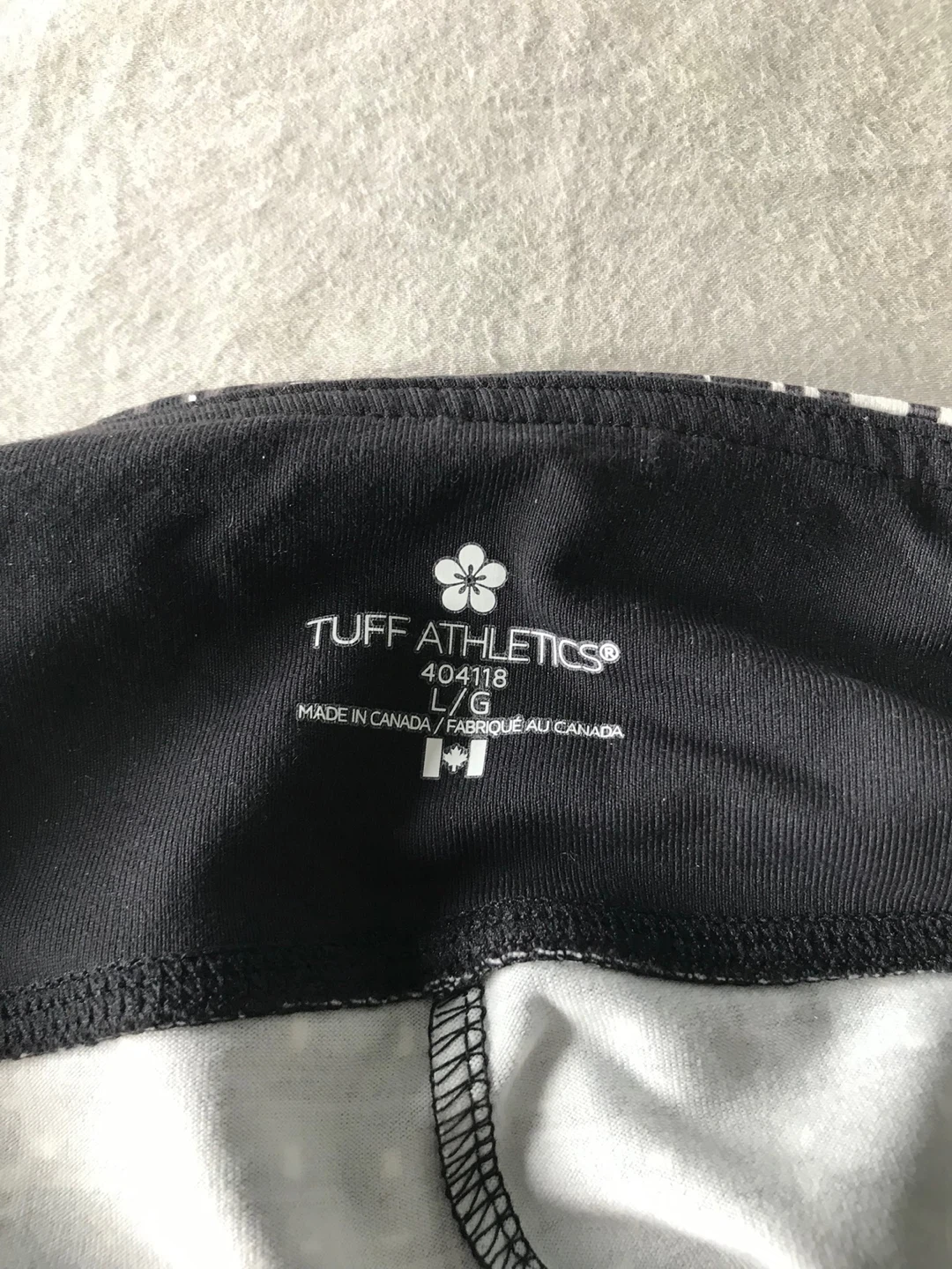 Tuff Athletics women's crop leggings in size L. Made in Canada. Black and white patterned design.