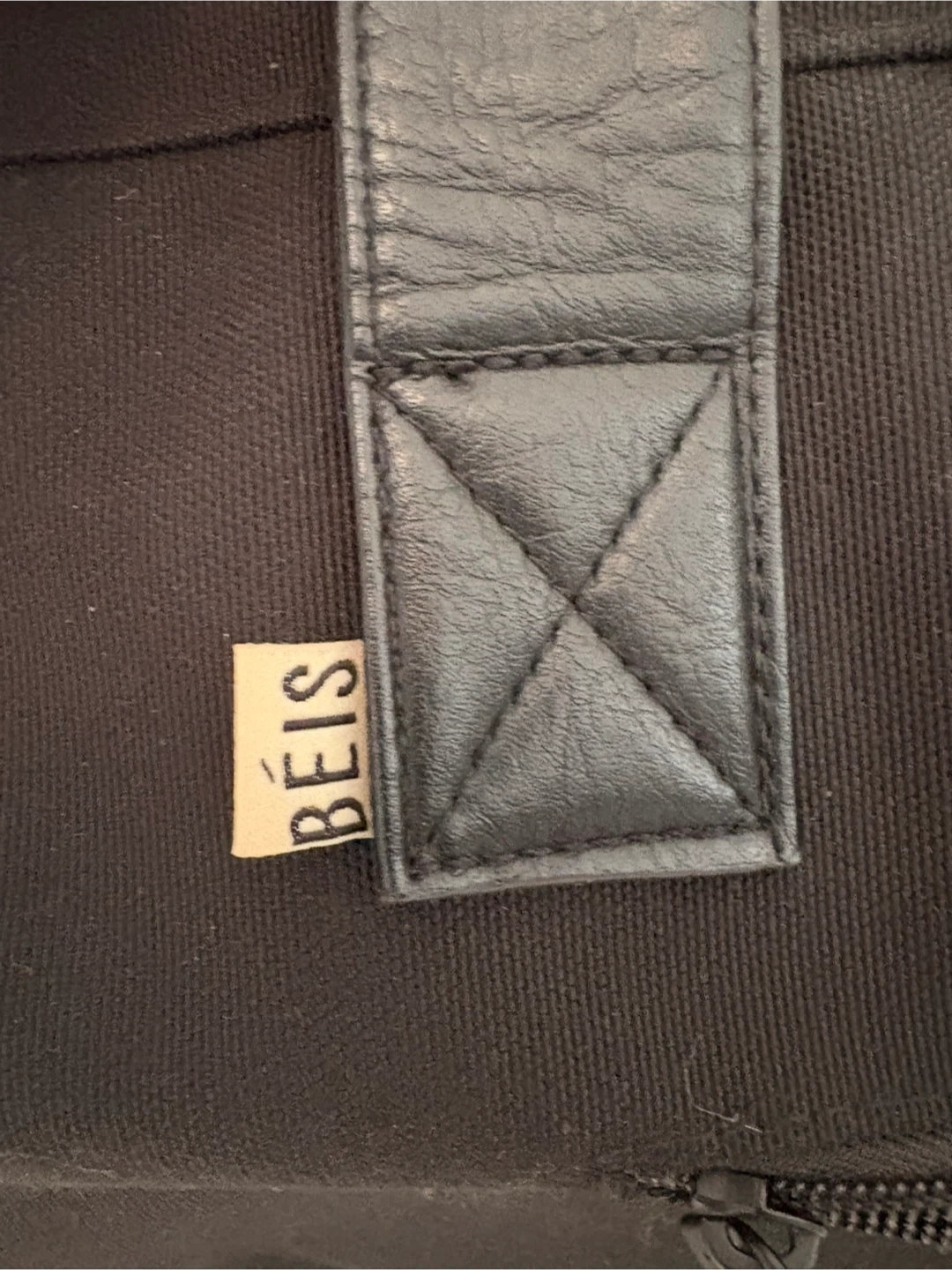 BEIS black weekender bag. It's made of durable canvas with faux leather accents. Lots of pockets for organization. Includes shoulder strap, trolley pocket, and shoe compartment
