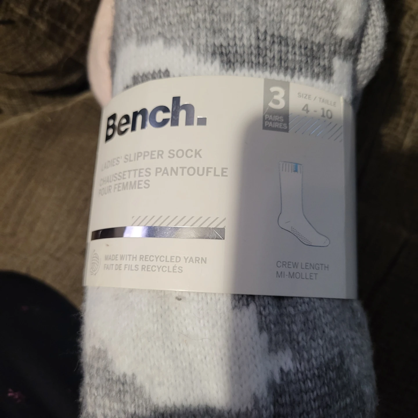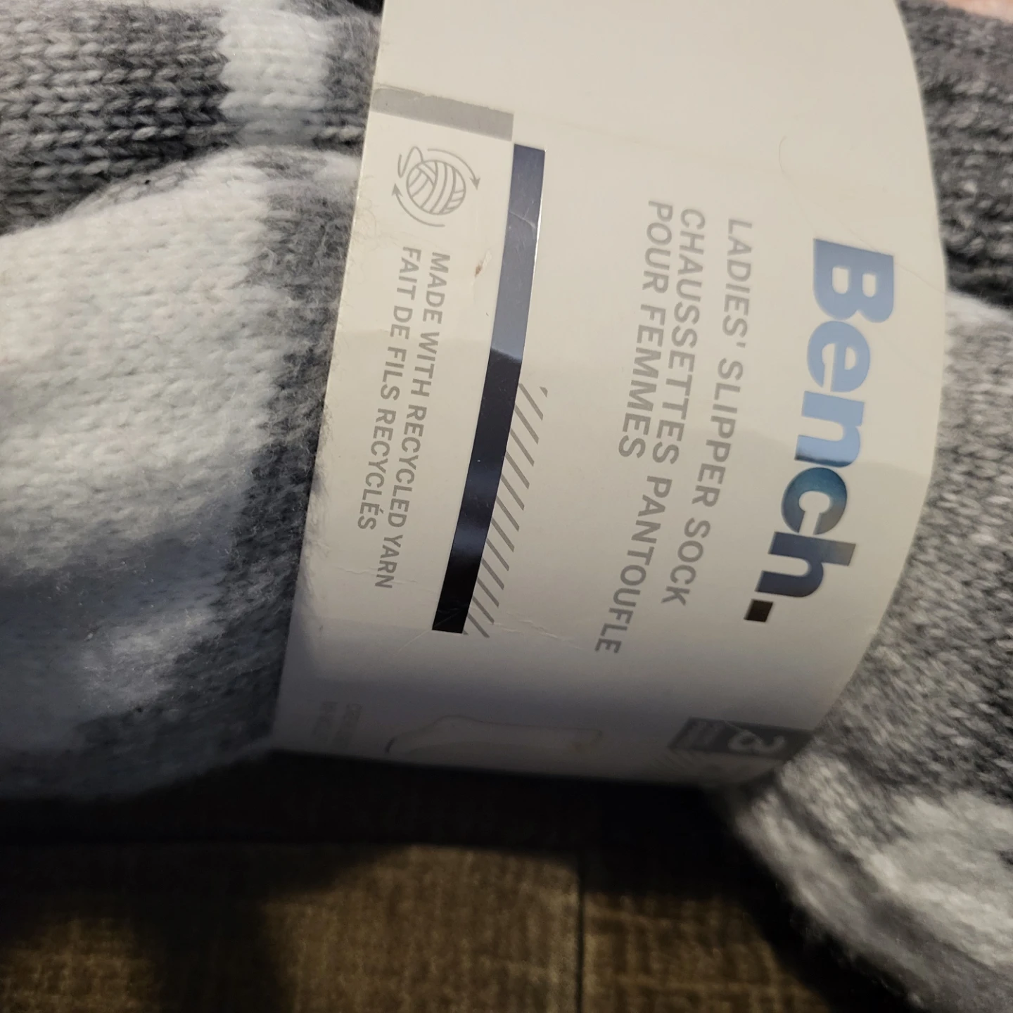 Here are some super cozy Bench ladies' slipper socks! They're size 4-10 and feature clear grippers and a sherpa lining to keep your feet warm and secure. Made with recycled yarn, these socks are both comfy and eco-friendly