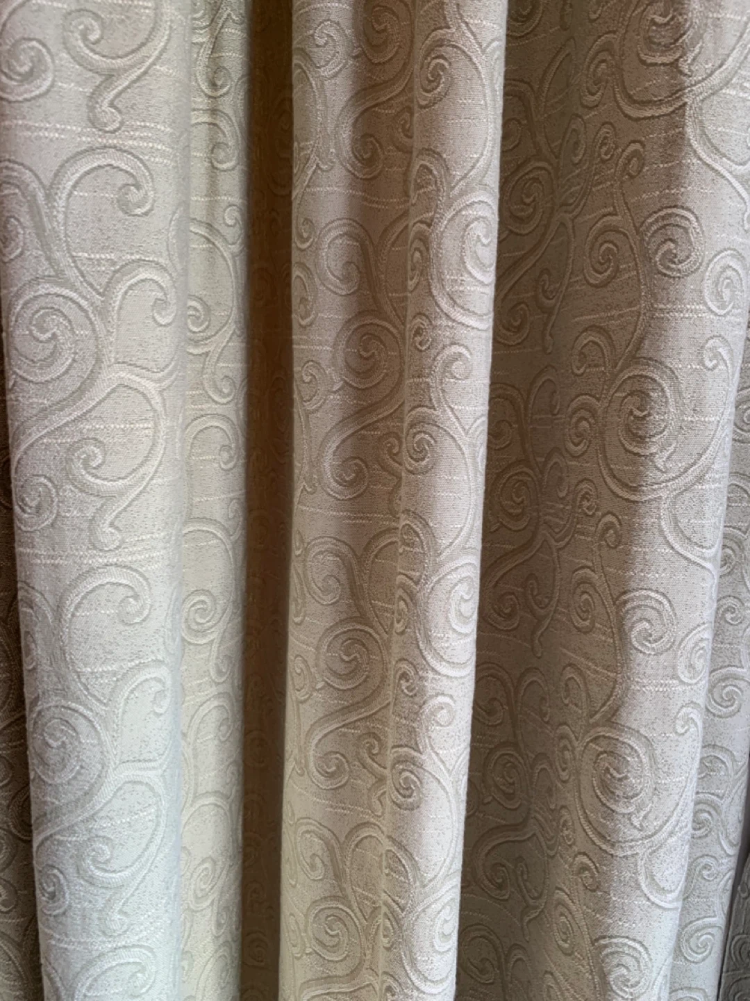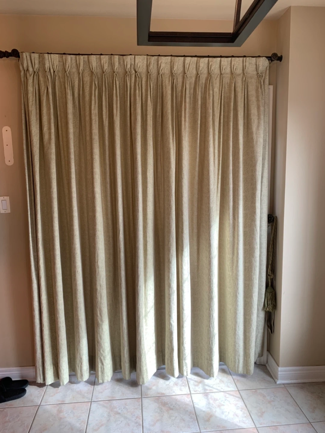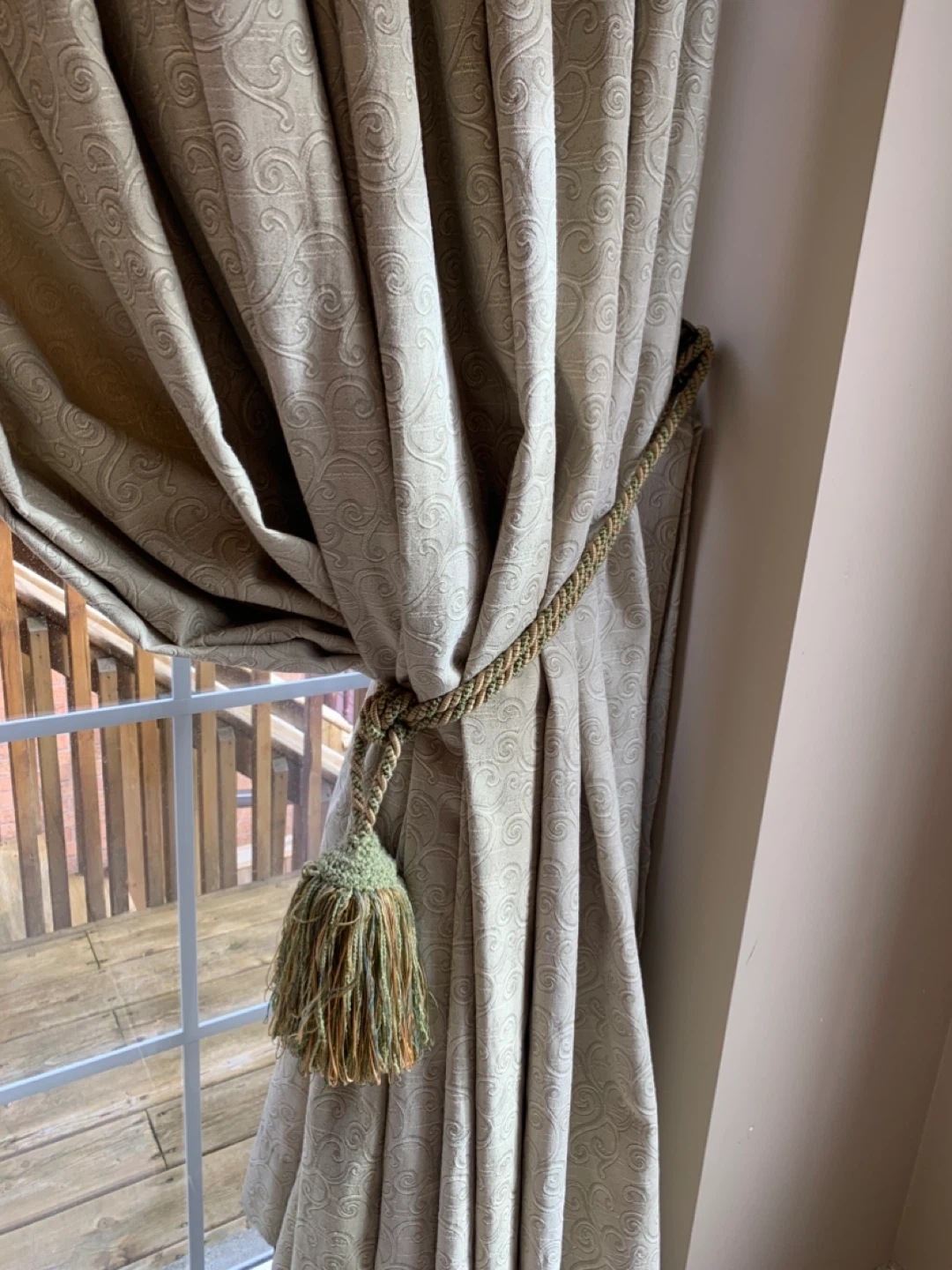 A single pleated curtain in a light green colour with a subtle swirl pattern. It's finished with a matching tassel tie-back. Adds a touch of elegance to any room!