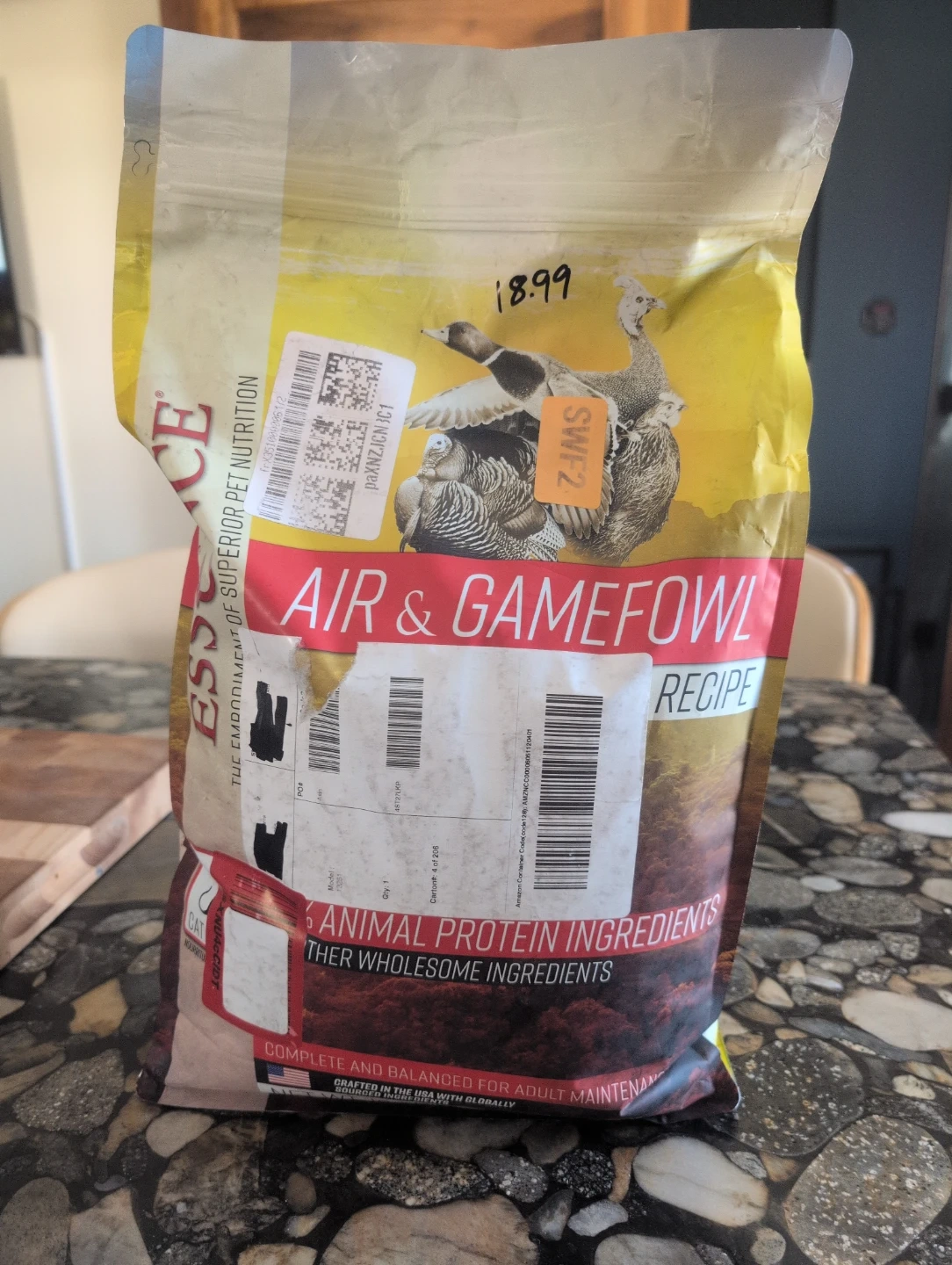 Essence Air & Gamefowl Recipe dog food bag. Made with animal protein ingredients and other wholesome ingredients. Complete and balanced for adult maintenance. Manufactured in the USA with globally sourced ingredients.