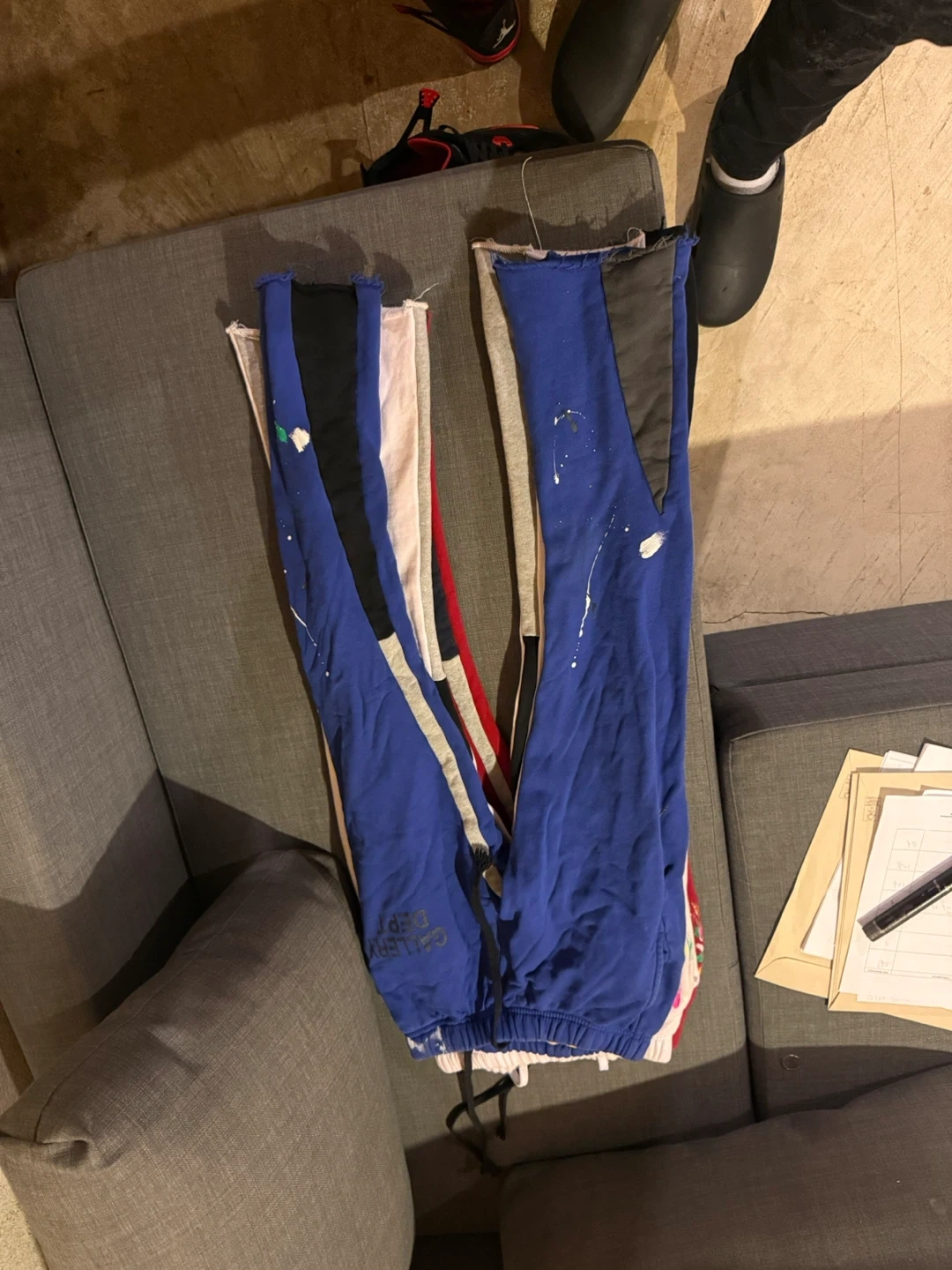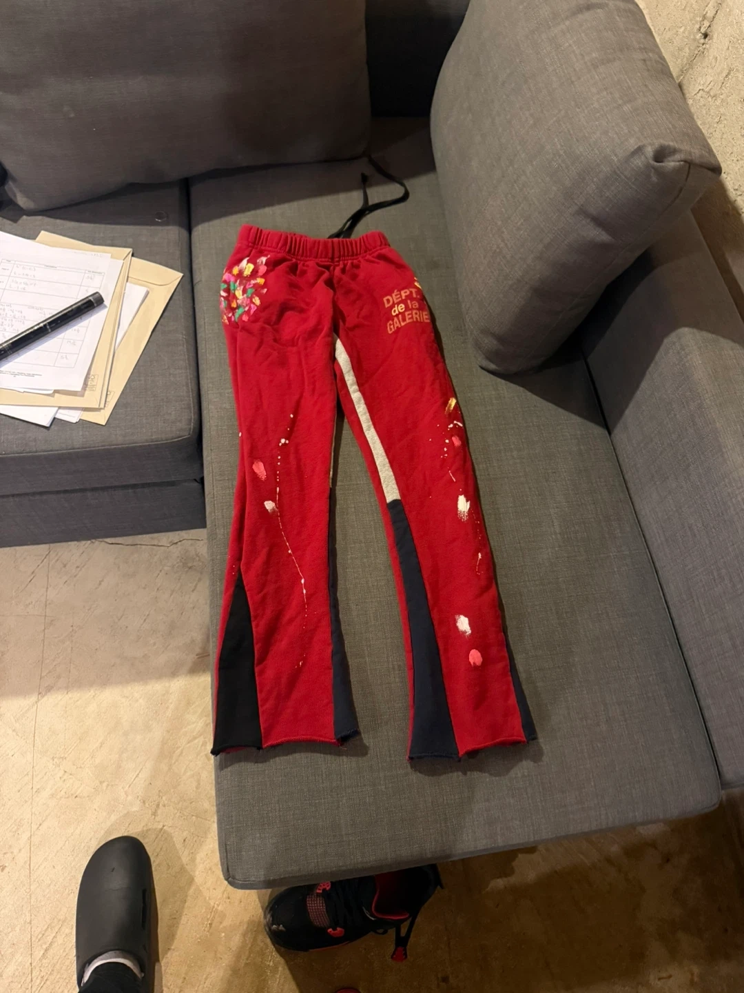 Gallery Dept. flared sweatpants with paint splatter details. These feature a patchwork design with contrasting panels. Comfortable for everyday wear! Selling individually