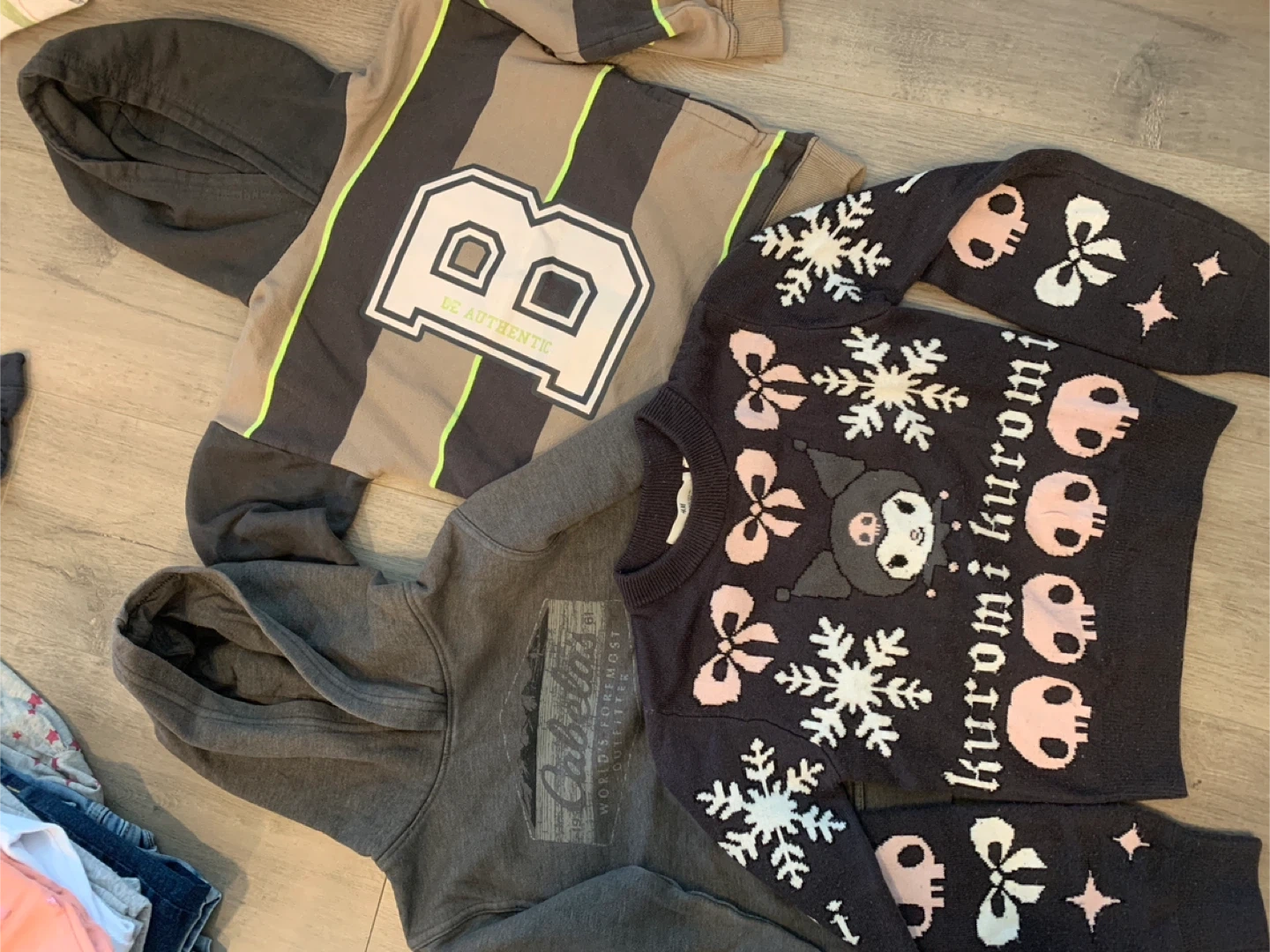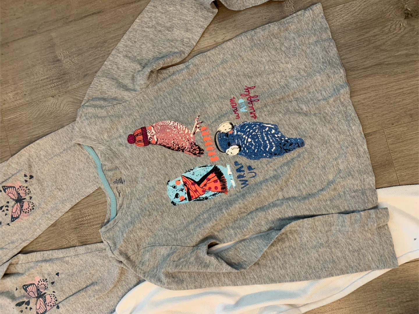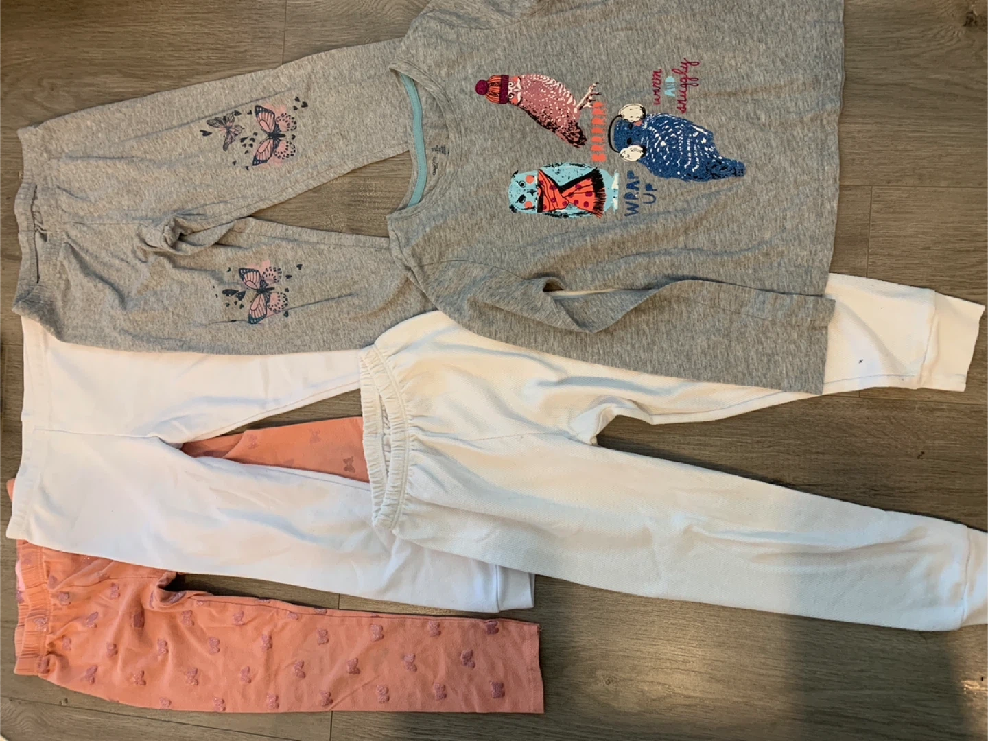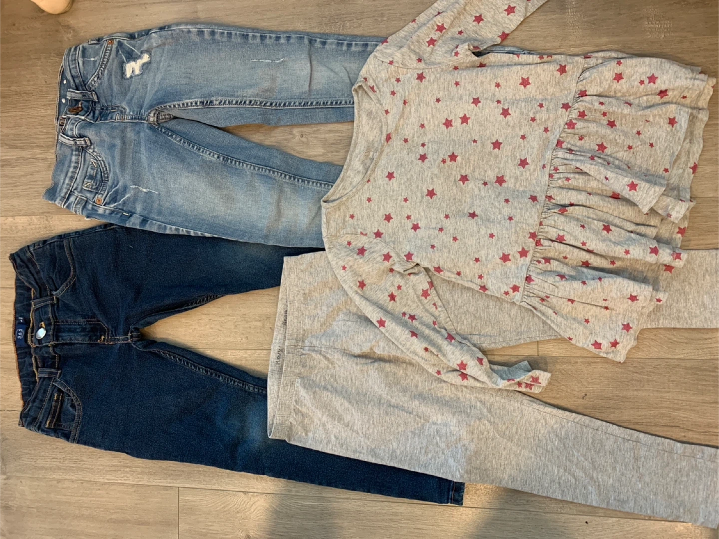 A bundle of girls' clothing including multiple pairs of pants and long-sleeved tops. Pants are denim and leggings in various colours and patterns. Tops feature fun graphics and designs. Great for everyday wear!