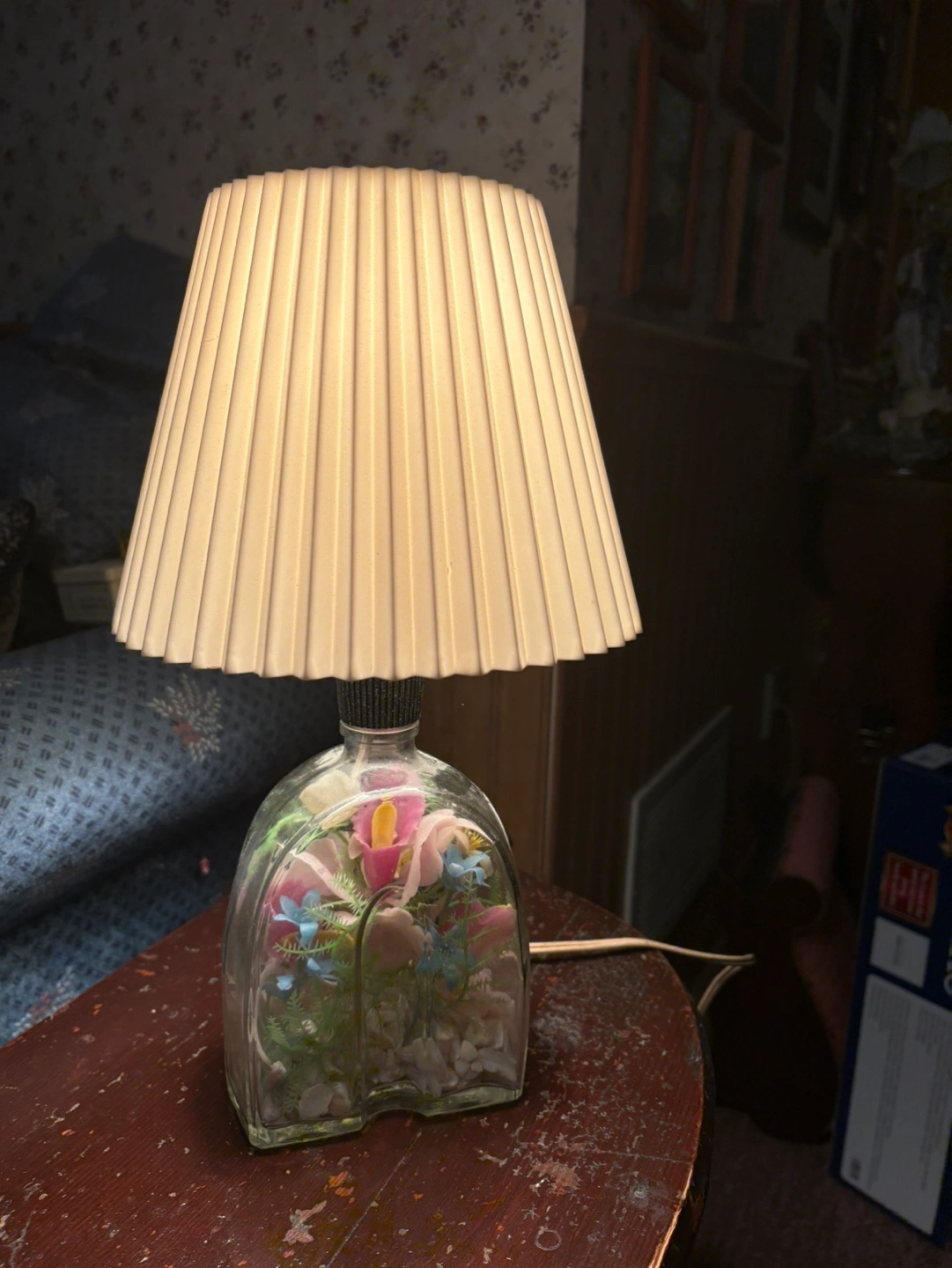 Vintage table lamp. Features a pleated lampshade and a unique base made from a clear glass bottle containing artificial flowers and decorative elements. Cord and plug included. Great accent piece for a bedroom or living room.