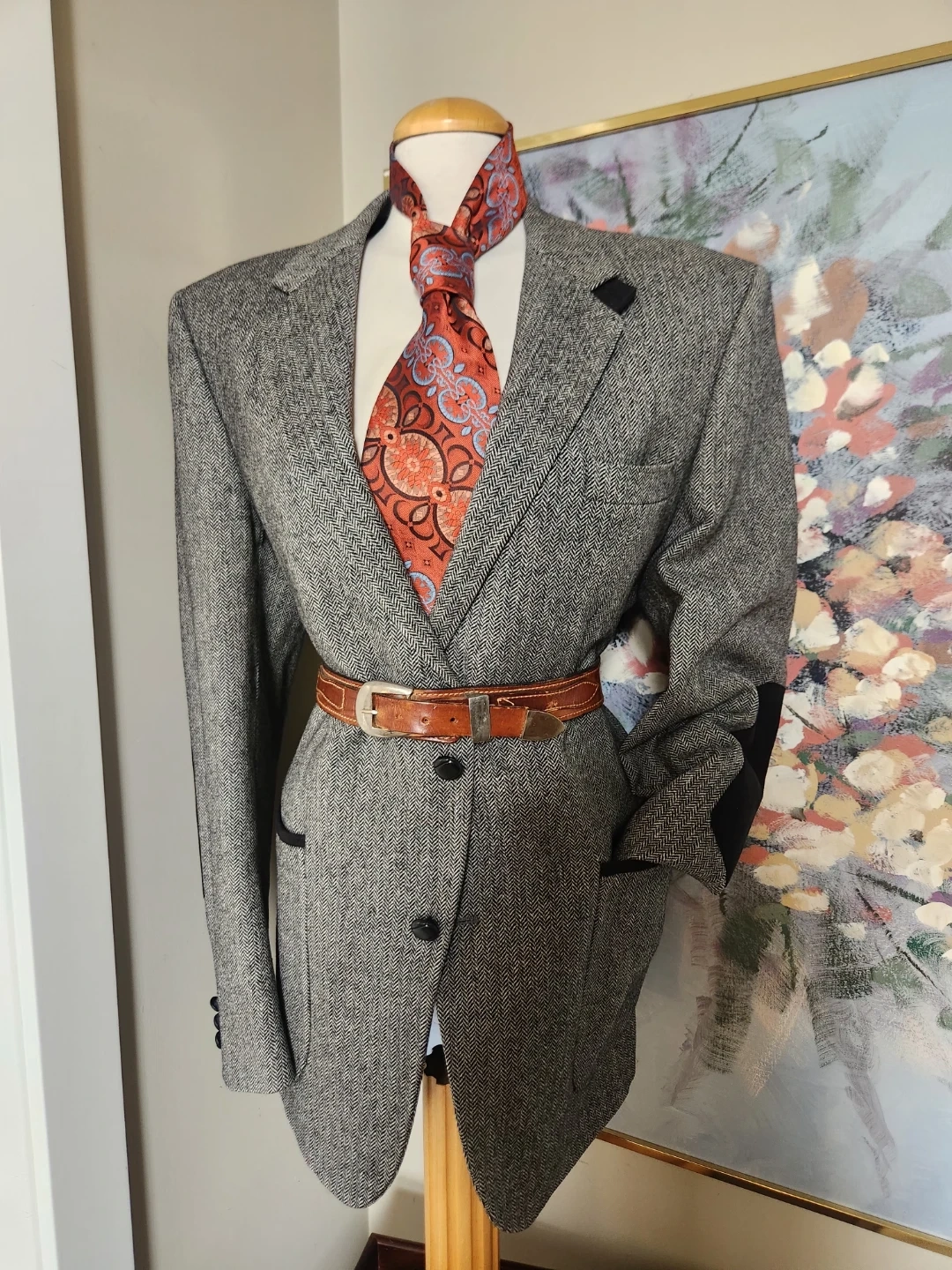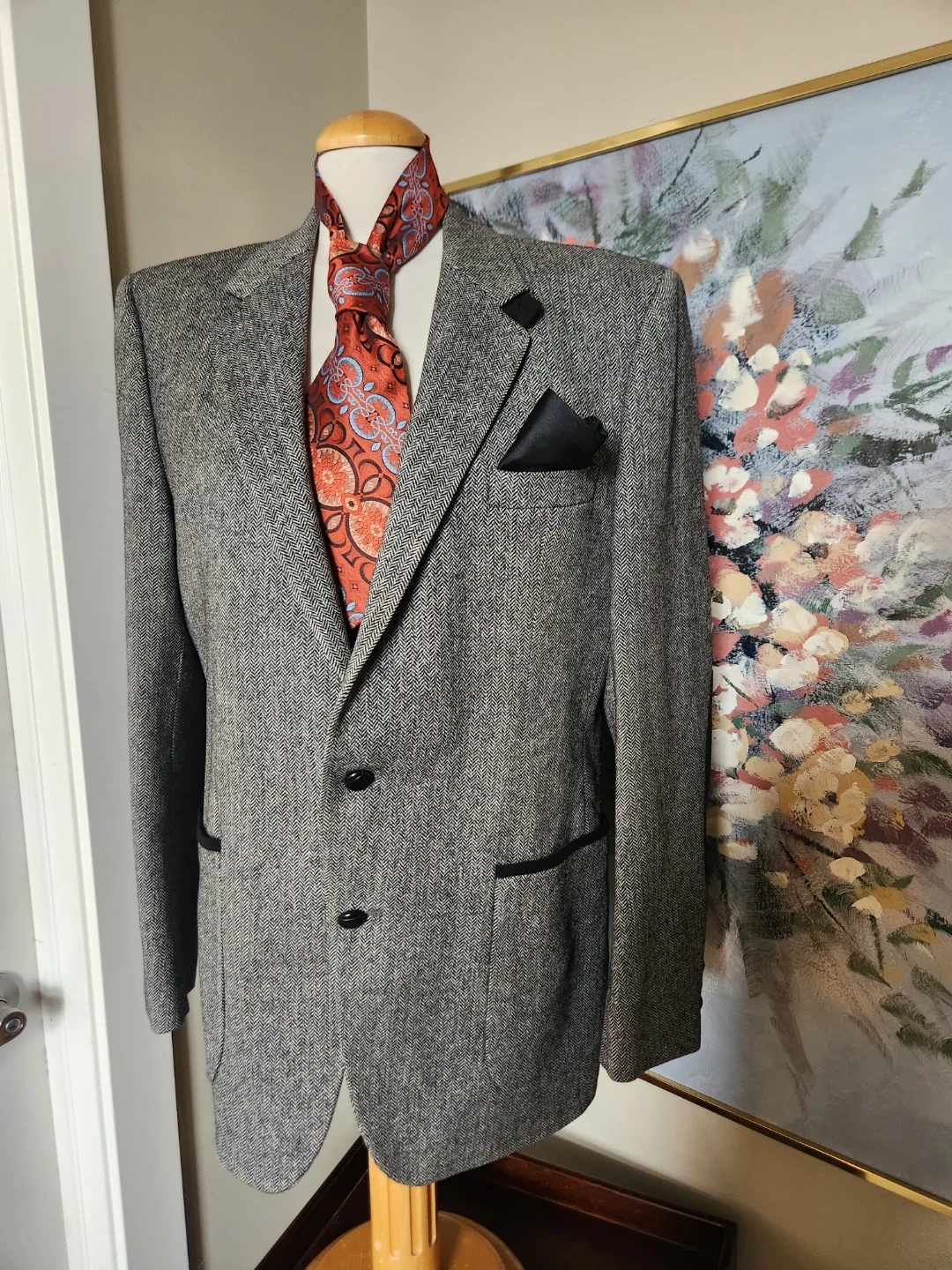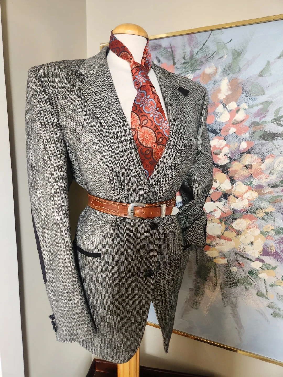 A stylish men's grey tweed blazer with a herringbone pattern. Features contrast trim on the pockets and elbow patches. Men's Blazer, but can be belted up and rocked by the ladies too! Two-button closure. Perfect for smart-casual occasions! And its drycleaned. 26 jacket length, 19 inch shoulder width, chest is 42 Inche diameter.