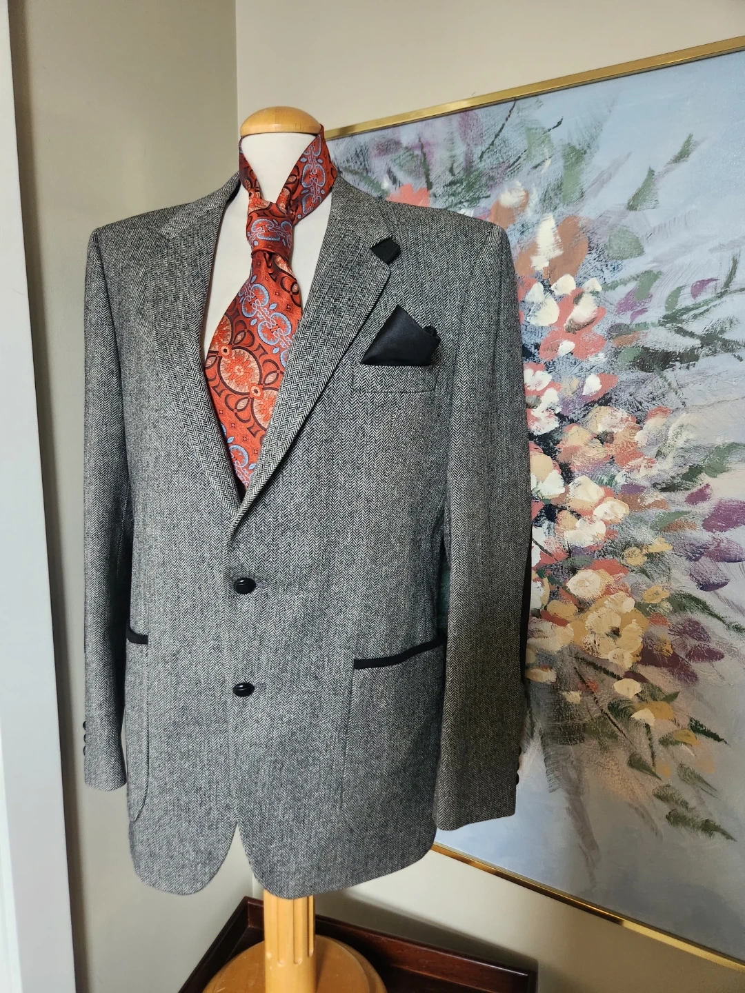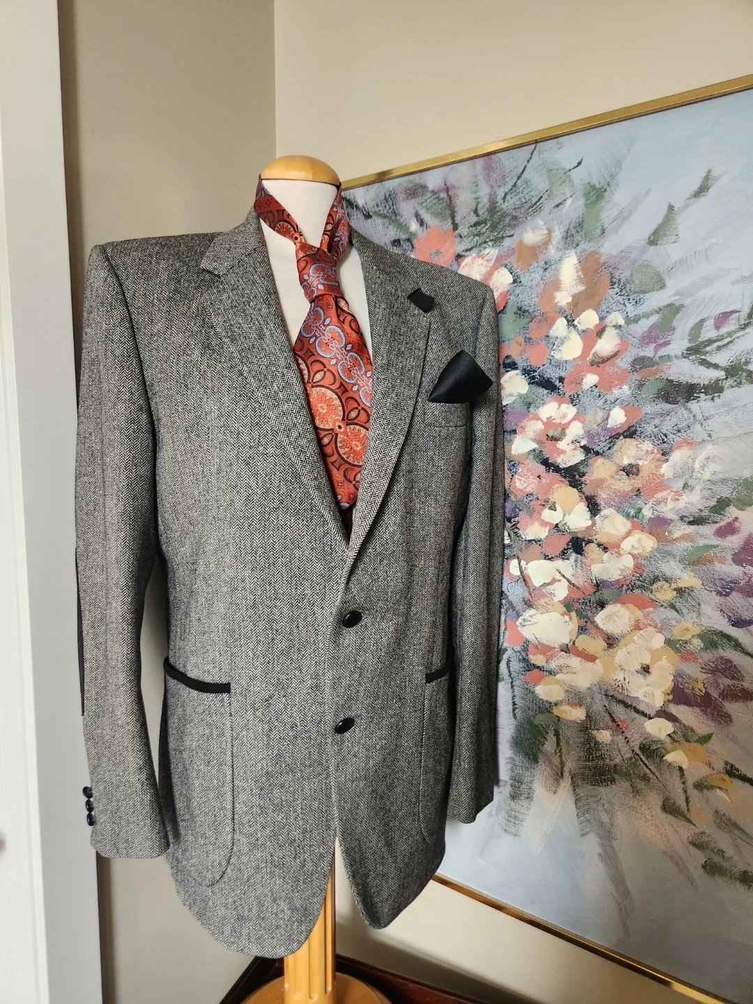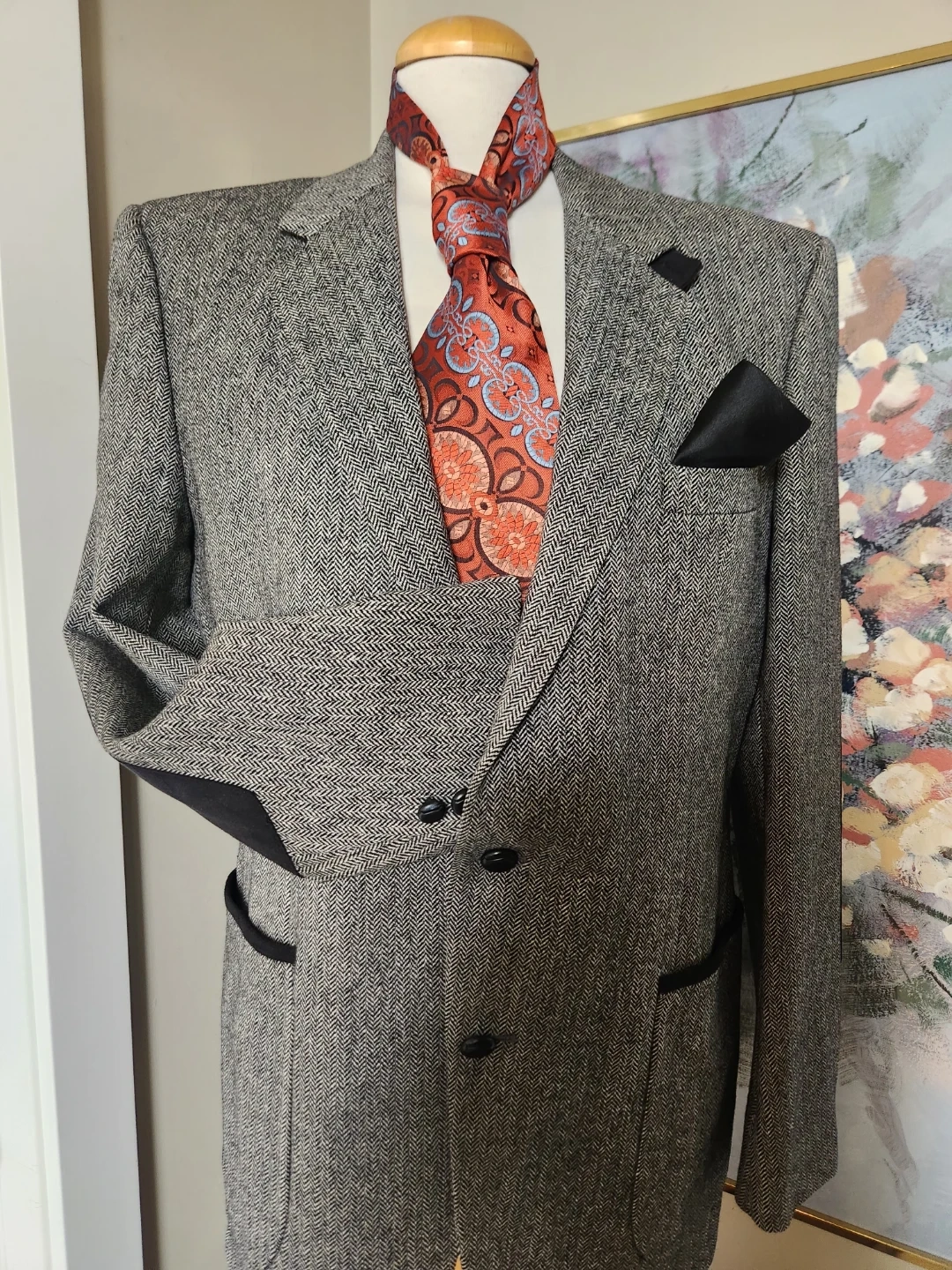 A stylish men's grey tweed blazer with a herringbone pattern. Features contrast trim on the pockets and elbow patches. Men's Blazer, but can be belted up and rocked by the ladies too! Two-button closure. Perfect for smart-casual occasions! And its drycleaned. 26 jacket length, 19 inch shoulder width, chest is 42 Inche diameter.