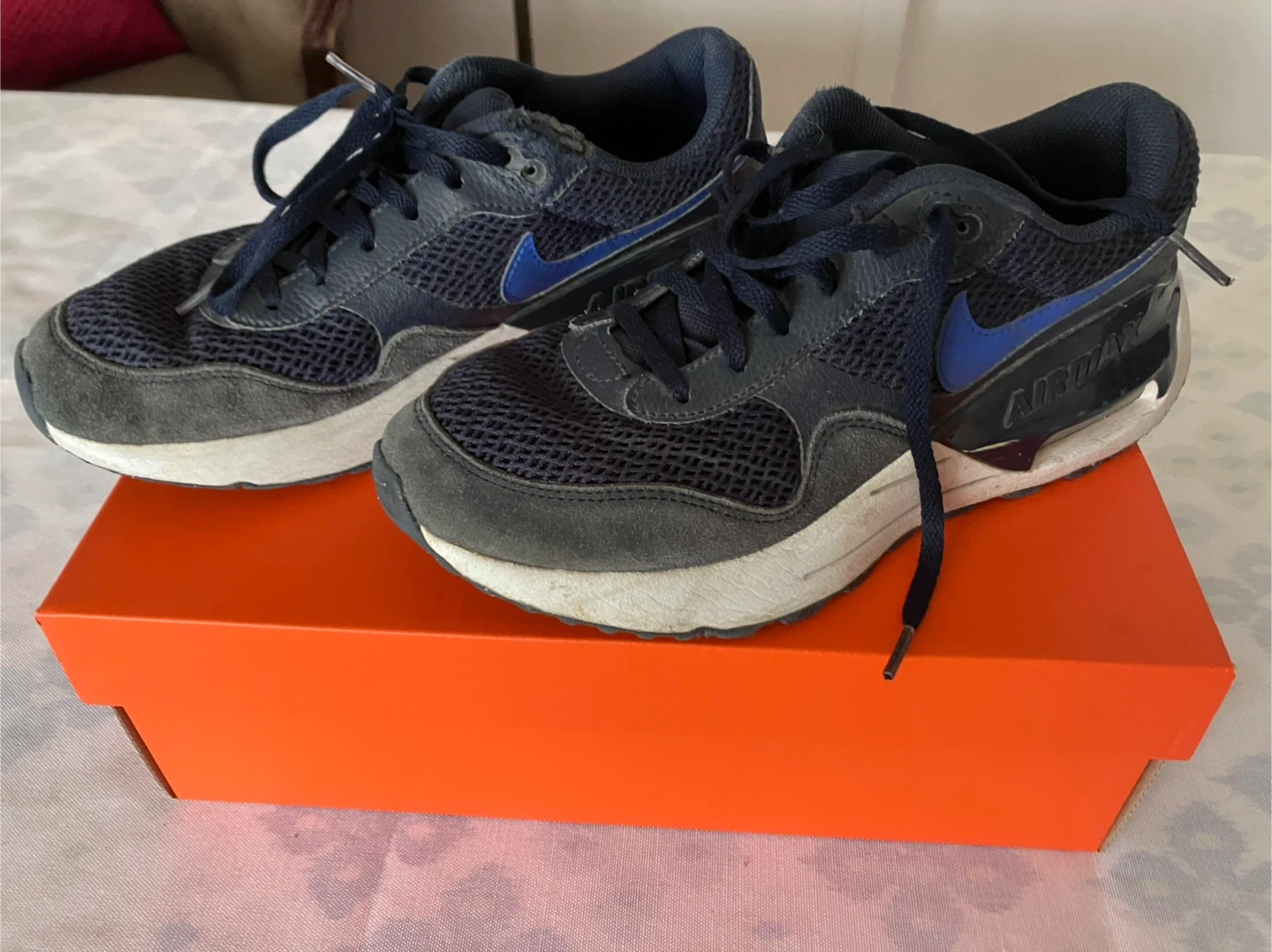 Selling a pair of Nike Air Max sneakers in blue. They are size 6Y (youth). These shoes come with the original box. Please see photos for condition!