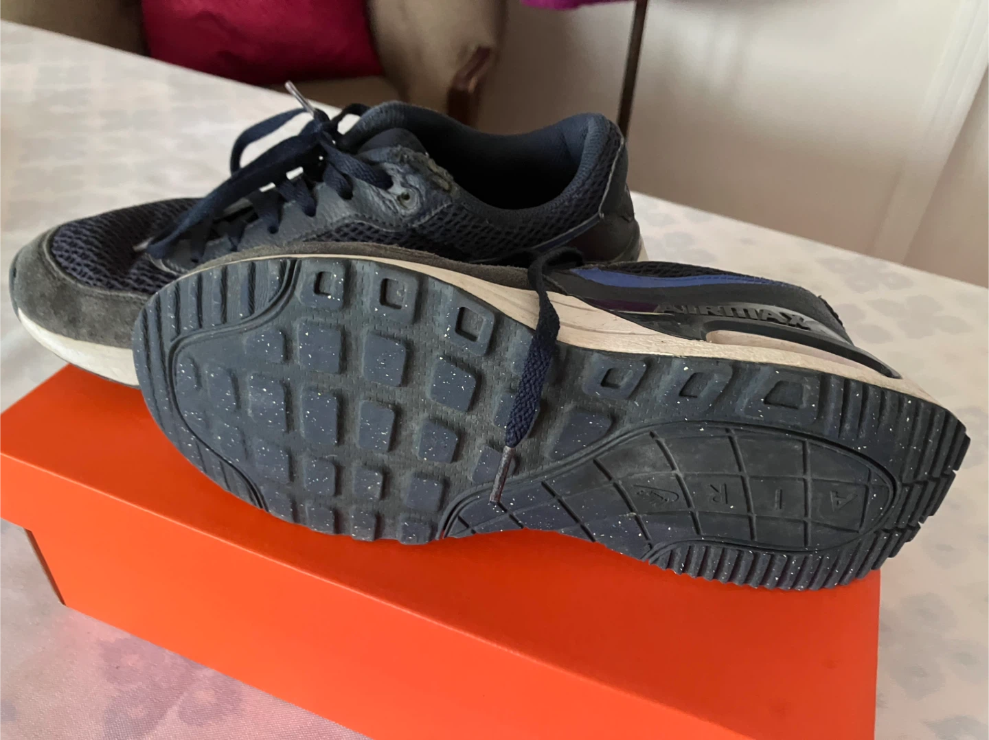Selling a pair of Nike Air Max sneakers in blue. They are size 6Y (youth). These shoes come with the original box. Please see photos for condition!