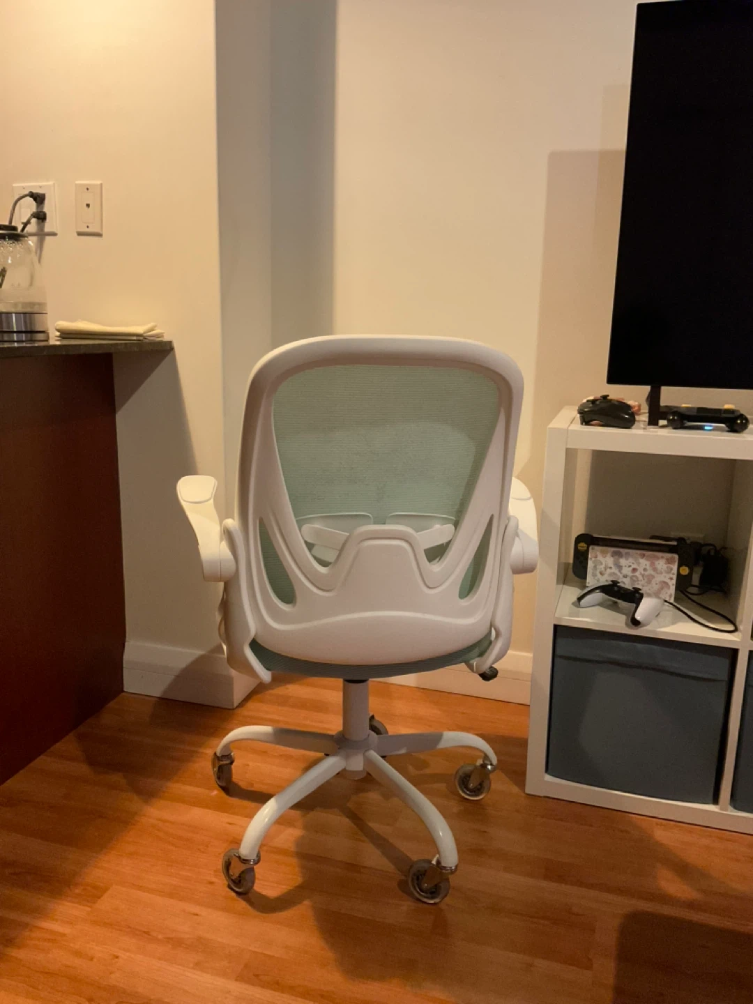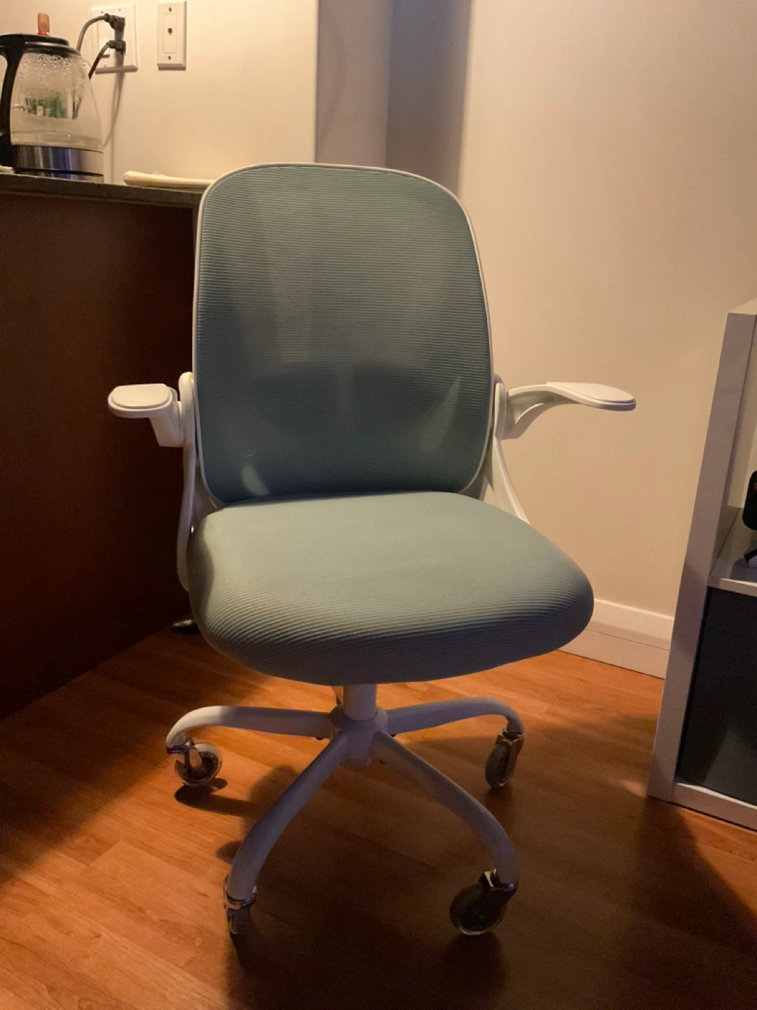 Light blue/green swivel chair with white accents.