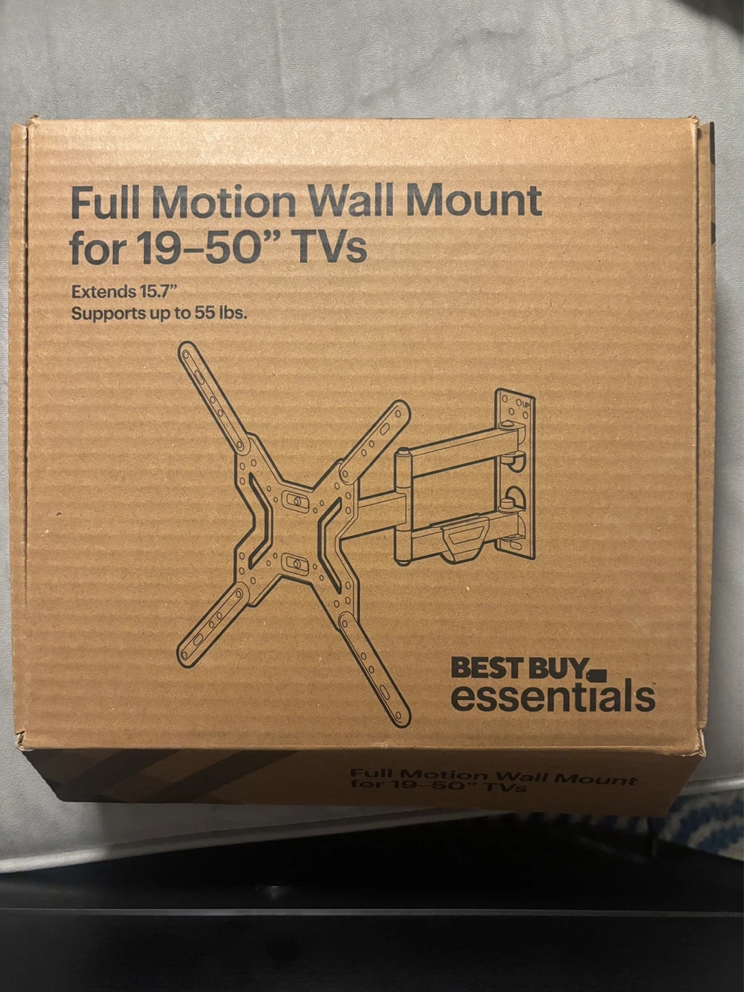 Full motion wall mount for 19-50 inch TVs. It extends 15.7 inches and supports up to 55 lbs. Includes user guide and mounting hardware.