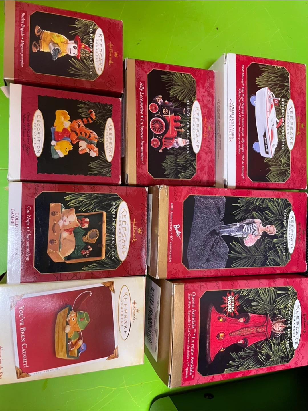 A collection of Hallmark Keepsake ornaments, including Barbie, Star Wars (Queen Amidala), Winnie the Pooh, and vehicles. Each comes in its original box.