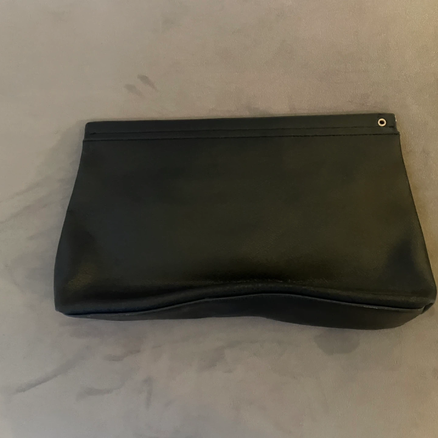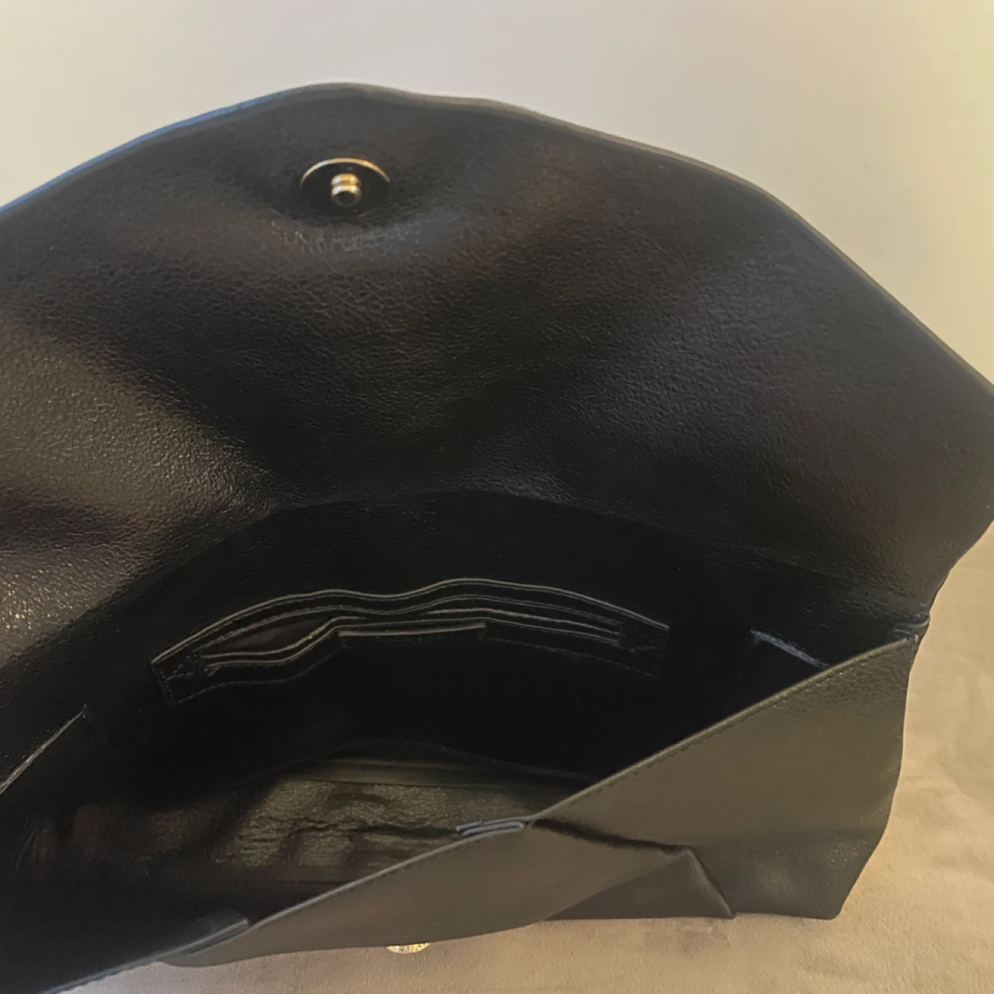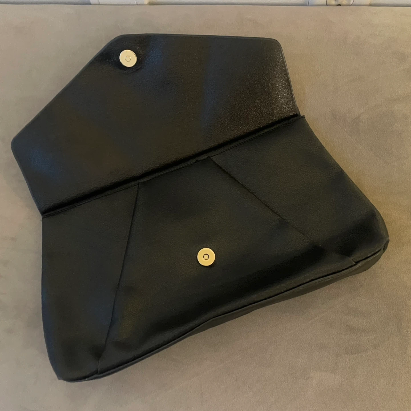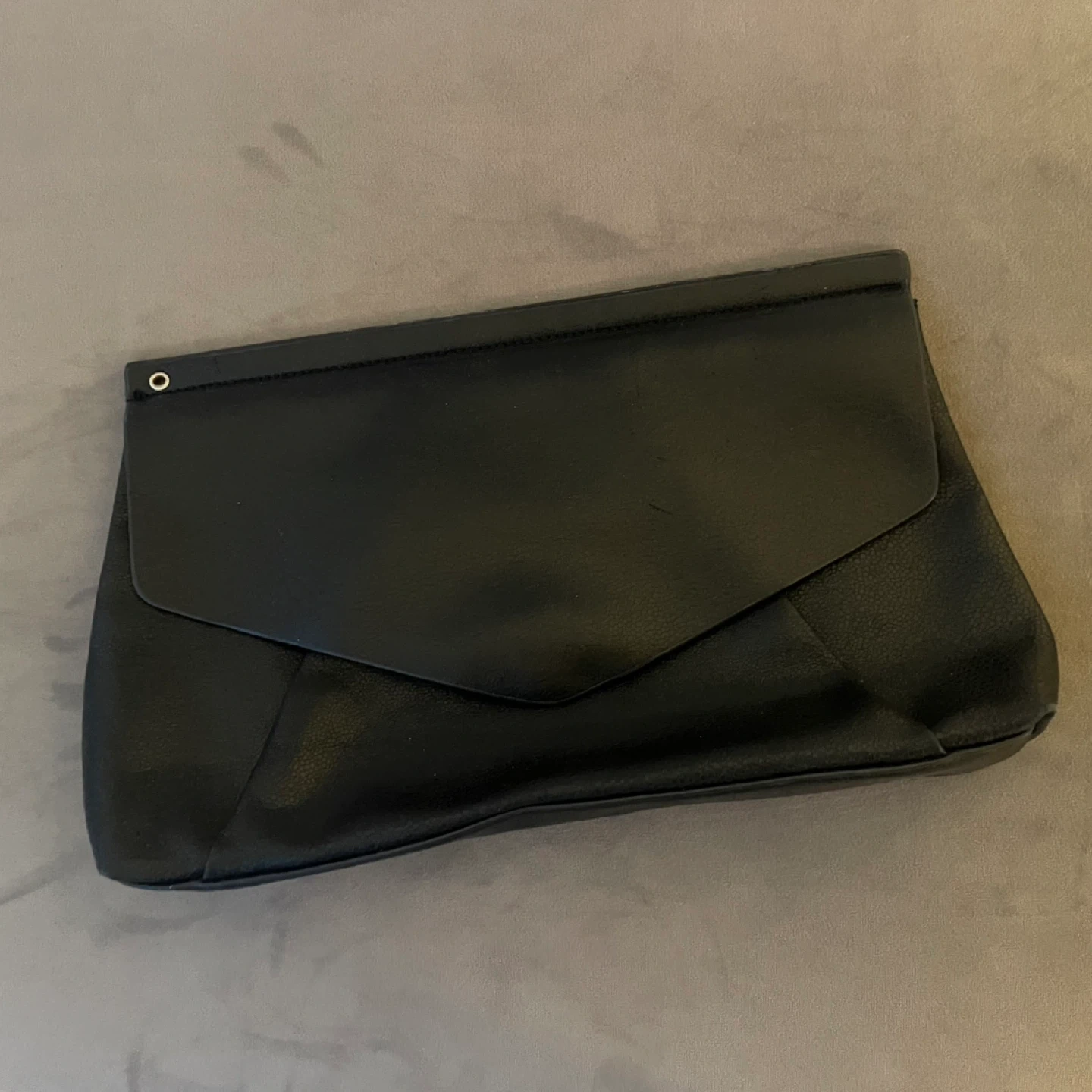 A stylish black clutch purse. It's made of faux leather and features a fold-over snap closure. The interior has a pocket.