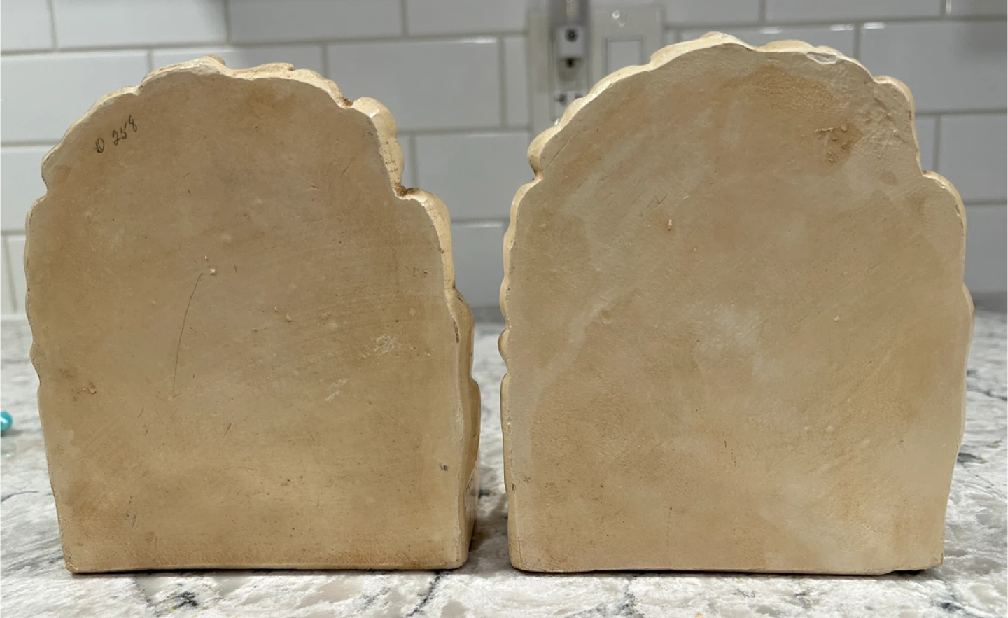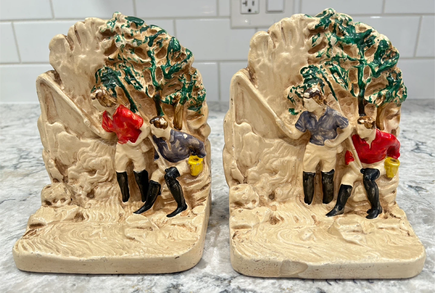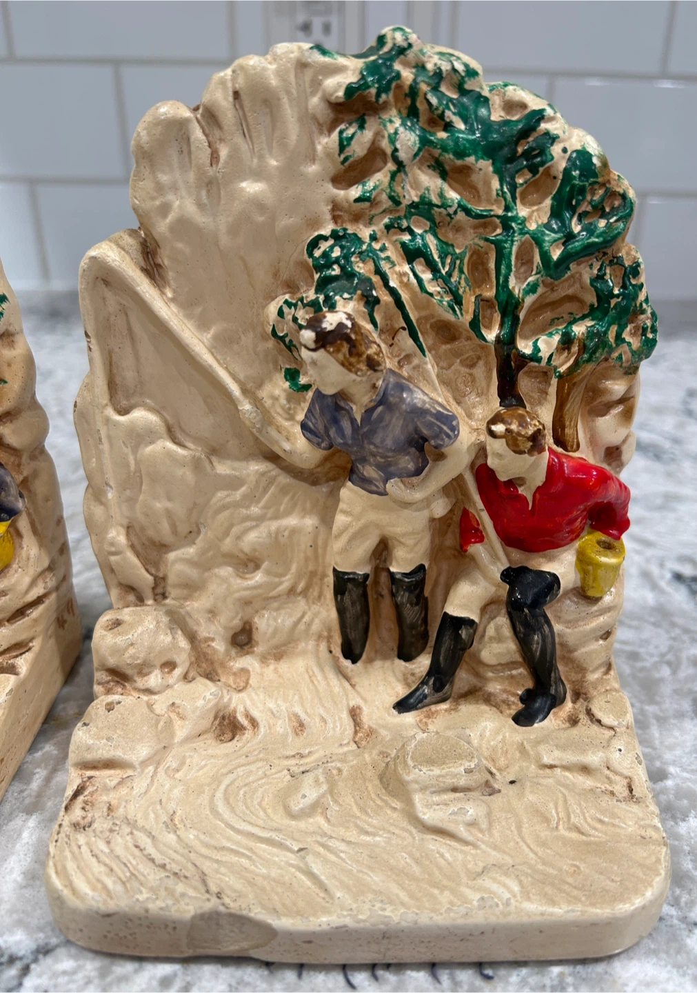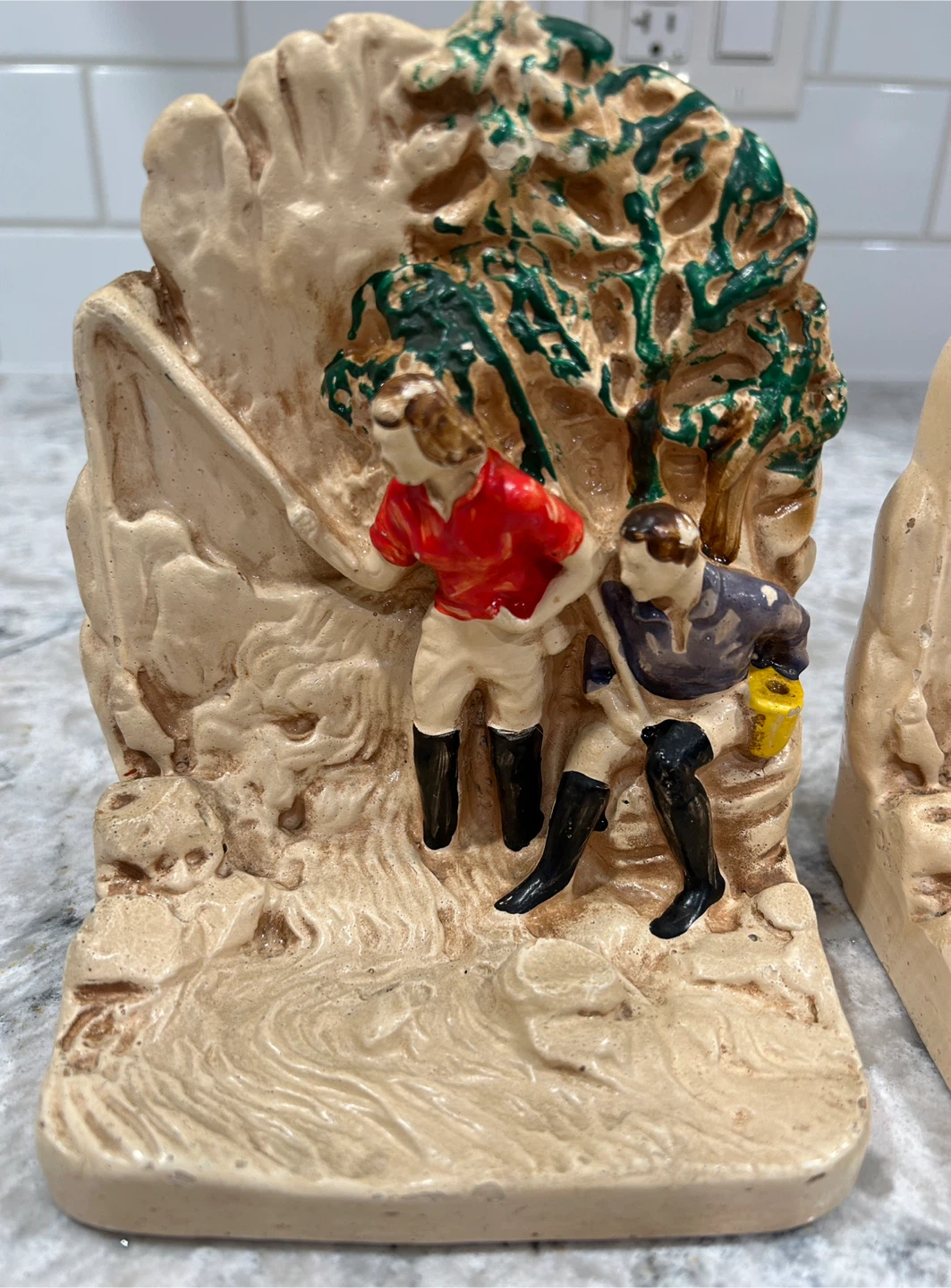Here's a charming set of vintage bookends! They feature a detailed scene with fishermen and a rocky, tree-filled landscape.