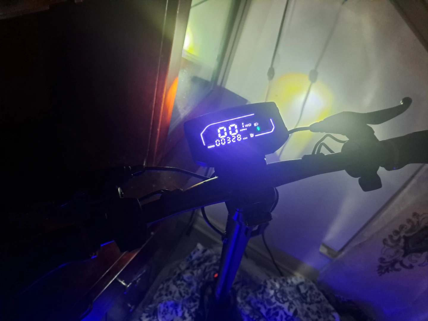 Electric scooter with a digital display showing speed and mileage. Connects to a mobile app for mode control and battery status. Has comfort mode, unlock, off, and cruise control functions.
