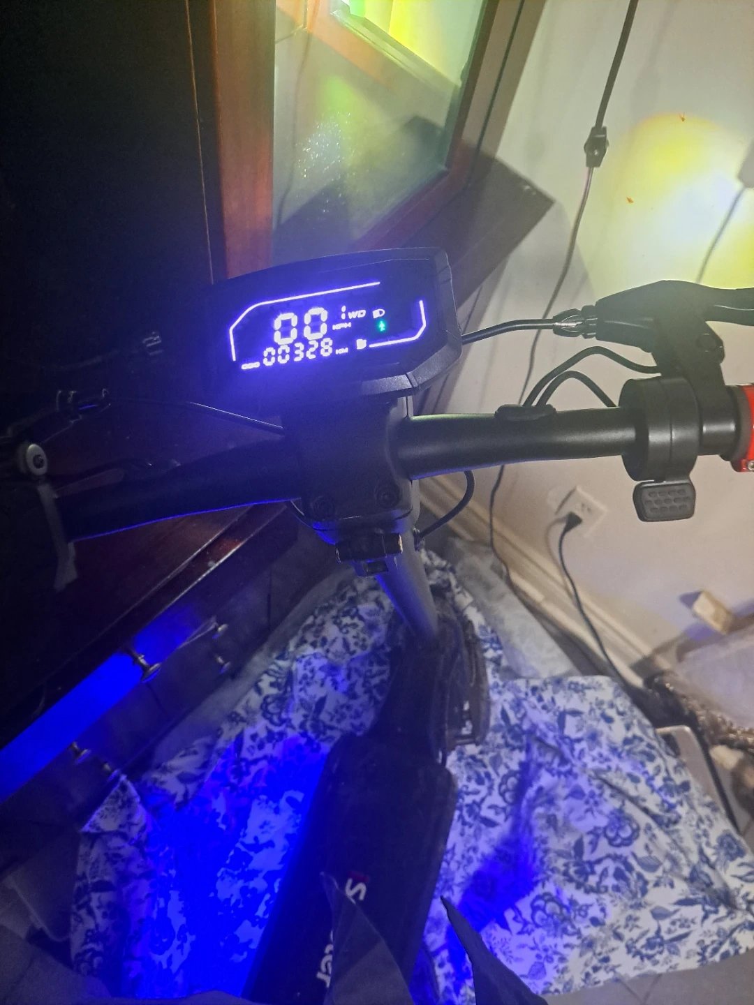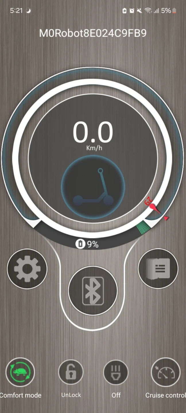 Electric scooter with a digital display showing speed and mileage. Connects to a mobile app for mode control and battery status. Has comfort mode, unlock, off, and cruise control functions.